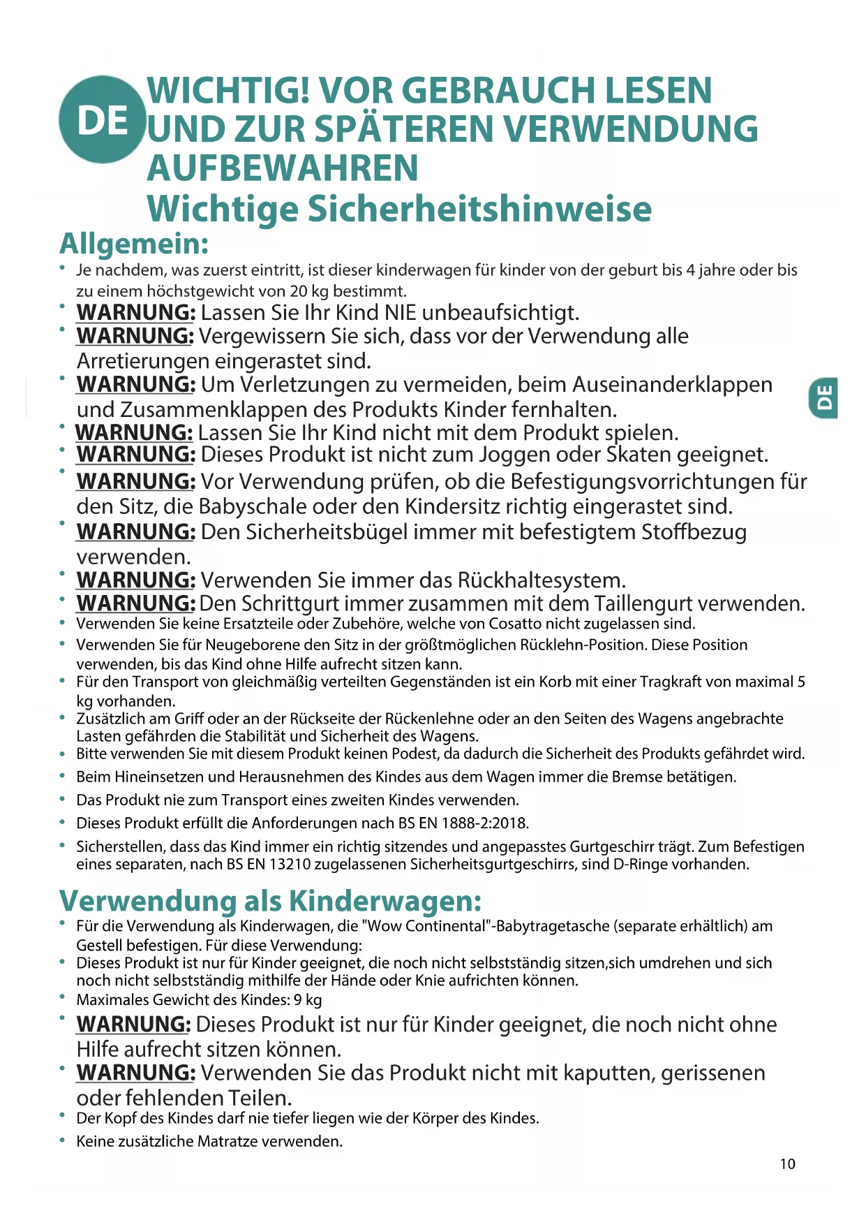 Verwenden Sie keine Ersatzteile oder Zubehöre, welche von Cosatto nicht zugelassen sind. Verwenden Sie für Neugeborene den Sitz in der größtmöglichen Rücklehn-Position. Diese Position verwenden, bis das Kind ohne Hilfe aufrecht sitzen kann. Für den Transport von gleichmäßig verteilten Gegenständen ist ein Korb mit einer Tragkraft von maximal 5 kg vorhanden.