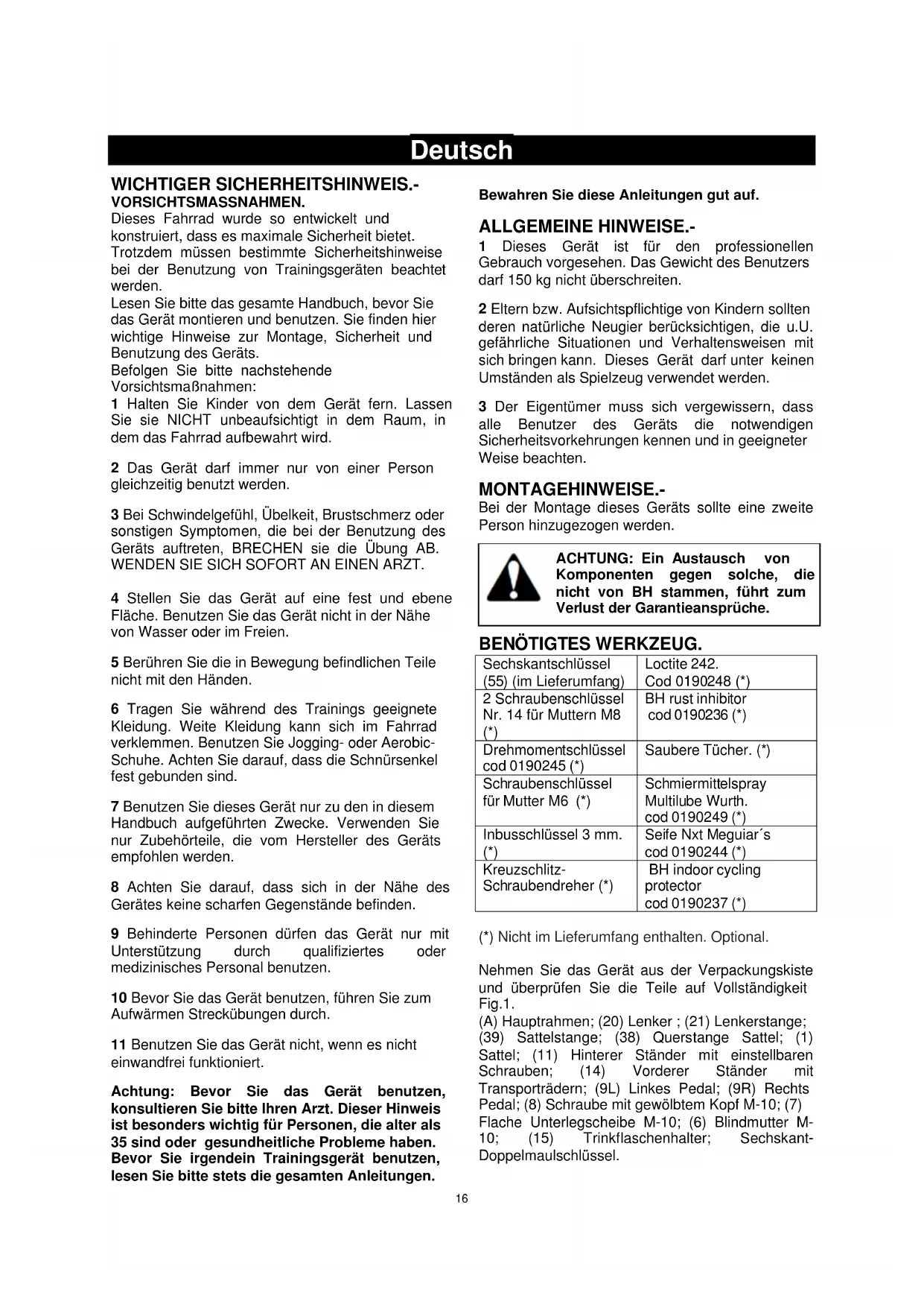 Deutsch WICHTIGER SICHERHEITSHINWEIS.- VORSICHTSMASSNAHMEN. Dieses Fahrrad wurde so entwickelt und konstruiert, dass es maximale Sicherheit bietet. Trotzdem müssen bestimmte Sicherheitshinweise bei der Benutzung von Trainingsgeräten beachtet werden. Lesen Sie bitte das gesamte Handbuch, bevor Sie das Gerät montieren und benutzen. Sie finden hier wichtige Hinweise zur Montage, Sicherheit und Benutzung des Geräts. Befolgen Sie bitte nachstehende Vorsichtsmaßnahmen: 1 Halten Sie Kinder von dem Gerät fern. Lassen Sie sie NICHT unbeaufsichtigt in dem Raum, in dem das Fahrrad aufbewahrt wird. 2 Das Gerät darf immer nur von einer Person gleichzeitig benutzt werden. 3 Bei Schwindelgefühl, Übelkeit, Brustschmerz oder sonstigen Symptomen, die bei der Benutzung des Geräts auftreten, BRECHEN sie die Übung AB. WENDEN SIE SICH SOFORT AN EINEN ARZT. 4 Stellen Sie das Gerät auf eine fest und ebene Fläche. Benutzen Sie das Gerät nicht in der Nähe von Wasser oder im Freien. 5 Berühren Sie die in Bewegung befindlichen Teile nicht mit den Händen. 6 Tragen Sie während des Trainings geeignete Kleidung. Weite Kleidung kann sich im Fahrrad verklemmen. Benutzen Sie Jogging- oder Aerobic- Schuhe. Achten Sie darauf, dass die Schnürsenkel fest gebunden sind. 7 Benutzen Sie dieses Gerät nur zu den in diesem Handbuch aufgeführten Zwecke. Verwenden Sie nur Zubehörteile, die vom Hersteller des Geräts empfohlen werden. 8 Achten Sie darauf, dass sich in der Nähe des Gerätes keine scharfen Gegenstände befinden. 9 Behinderte Personen dürfen das Gerät nur mit Unterstützung durch qualifiziertes oder medizinisches Personal benutzen. 10 Bevor Sie das Gerät benutzen, führen Sie zum Aufwärmen Streckübungen durch. 11 Benutzen Sie das Gerät nicht, wenn es nicht einwandfrei funktioniert. Achtung: Bevor Sie das Gerät benutzen, konsultieren Sie bitte Ihren Arzt. Dieser Hinweis ist besonders wichtig für Personen, die alter als 35 sind oder gesundheitliche Probleme haben. Bevor Sie irgendein Trainingsgerät benutzen, lesen Sie bitte stets die gesamten Anleitungen. Bewahren Sie diese Anleitungen gut auf. ALLGEMEINE HINWEISE.- 1 Dieses Gerät ist für den professionellen Gebrauch vorgesehen. Das Gewicht des Benutzers darf 150 kg nicht überschreiten. 2 Eltern bzw. Aufsichtspflichtige von Kindern sollten deren natürliche Neugier berücksichtigen, die u.U. gefährliche Situationen und Verhaltensweisen mit sich bringen kann. Dieses Gerät darf unter keinen Umständen als Spielzeug verwendet werden. 3 Der Eigentümer muss sich vergewissern, dass alle Benutzer des Geräts die notwendigen Sicherheitsvorkehrungen kennen und in geeigneter Weise beachten. MONTAGEHINWEISE.- Bei der Montage dieses Geräts sollte eine zweite Person hinzugezogen werden. ACHTUNG: Ein Austausch von Komponenten gegen solche, die nicht von BH stammen, führt zum Verlust der Garantieansprüche. BENÖTIGTES WERKZEUG. Sechskantschlüssel (55) (im Lieferumfang) Loctite 242. Cod 0190248 (*) 2 Schraubenschlüssel Nr. 14 für Muttern M8