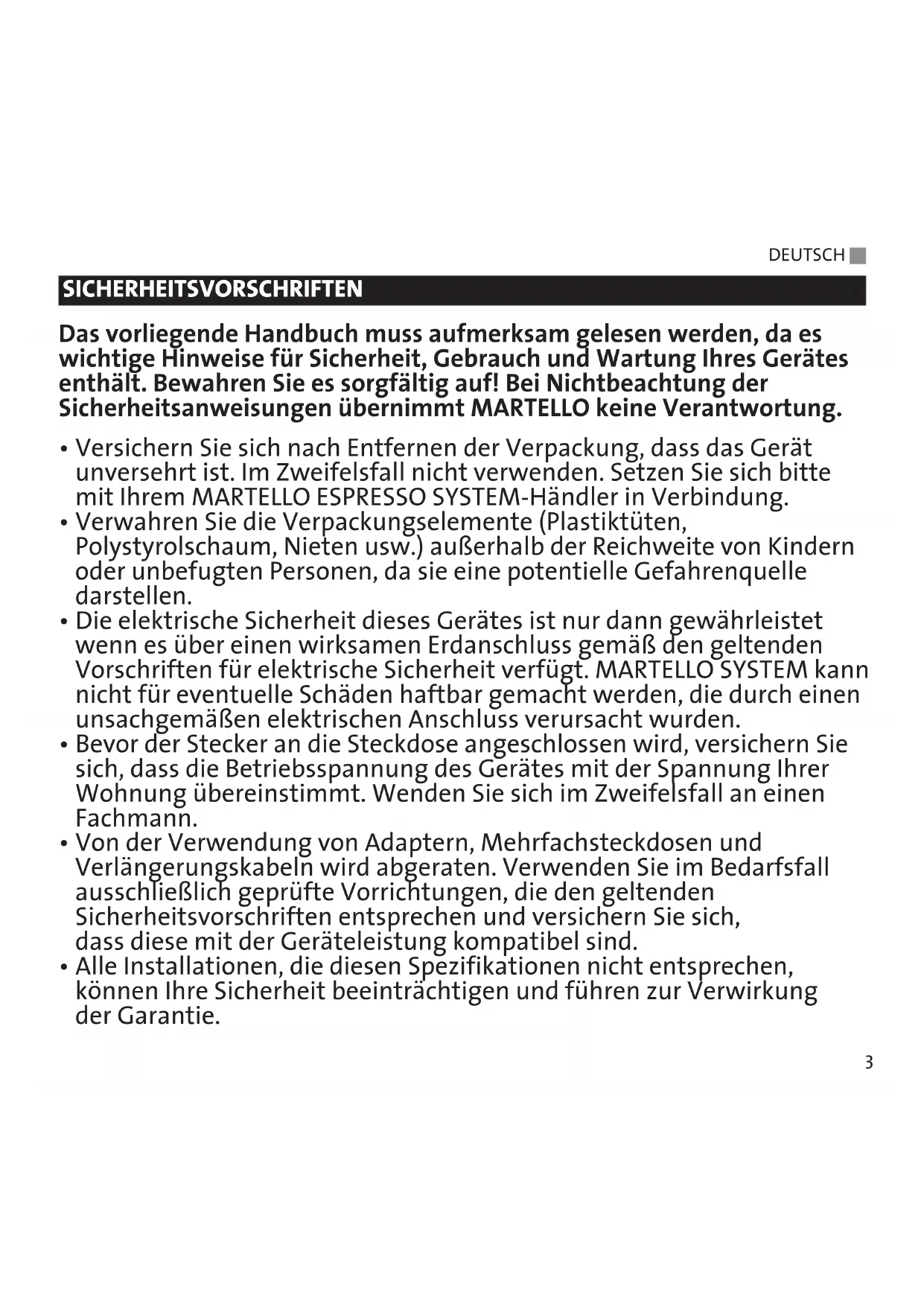 - Alle Installationen, die diesen Spezifikationen nicht entsprechen, können Ihre Sicherheit beeinträchtigen und führen zur Verwirkung der Garantie. DEUTSCH g SICHERHEITSVORSCHRIFTEN MARTELLO_HoferVaria-2013_IM_DE_2013-08-27_De 08.11.13 12:44 Seite 3• Das Gerät ist ausschließlich für den häuslichen Gebrauch zur Zubereitung von Espresso-Café mit MARTELLO SYSTEM Kapseln bestimmt.