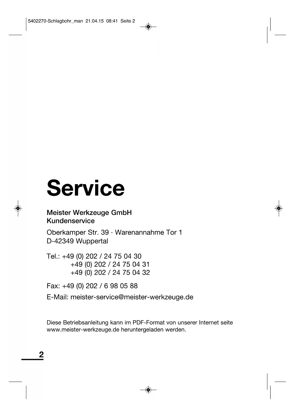 Ingo Heimann (M.Sc.) Technische Leitung/Produktentwicklung Meister Werkzeuge GmbH · Oberkamper Straße 37 - 39 · D-42349 Wuppertal D - Autorisierte Person zur Aufbewahrung der technischen Unterlagen. 5402270-Schlagbohr_man 21.04.15 08:41 Seite 73© Copyright Nachdruck oder Vervielfältigung – auch aus - zugs weise – nur mit Genehmigung der Meister Werkzeuge GmbH Oberkamper Str. 37– 39 D-42349 Wuppertal Germany 2015/2016 Diese Druckschrift einschließlich aller ihrer Teile ist urheberrechtlich geschützt. Jede Verwertung außerhalb der engen Grenzen des Urheberrechtsgesetzes ist ohne Zustim mung der Meister Werkzeuge GmbH unzu lässig und strafbar. Das gilt insbesondere für Vervielfältigungen, Übersetzungen, Mikroverfilmungen und die Ein speisung und Verarbeitung in elektronischen Systemen. 5402270-Schlagbohr_man 21.04.15 08:41 Seite 74