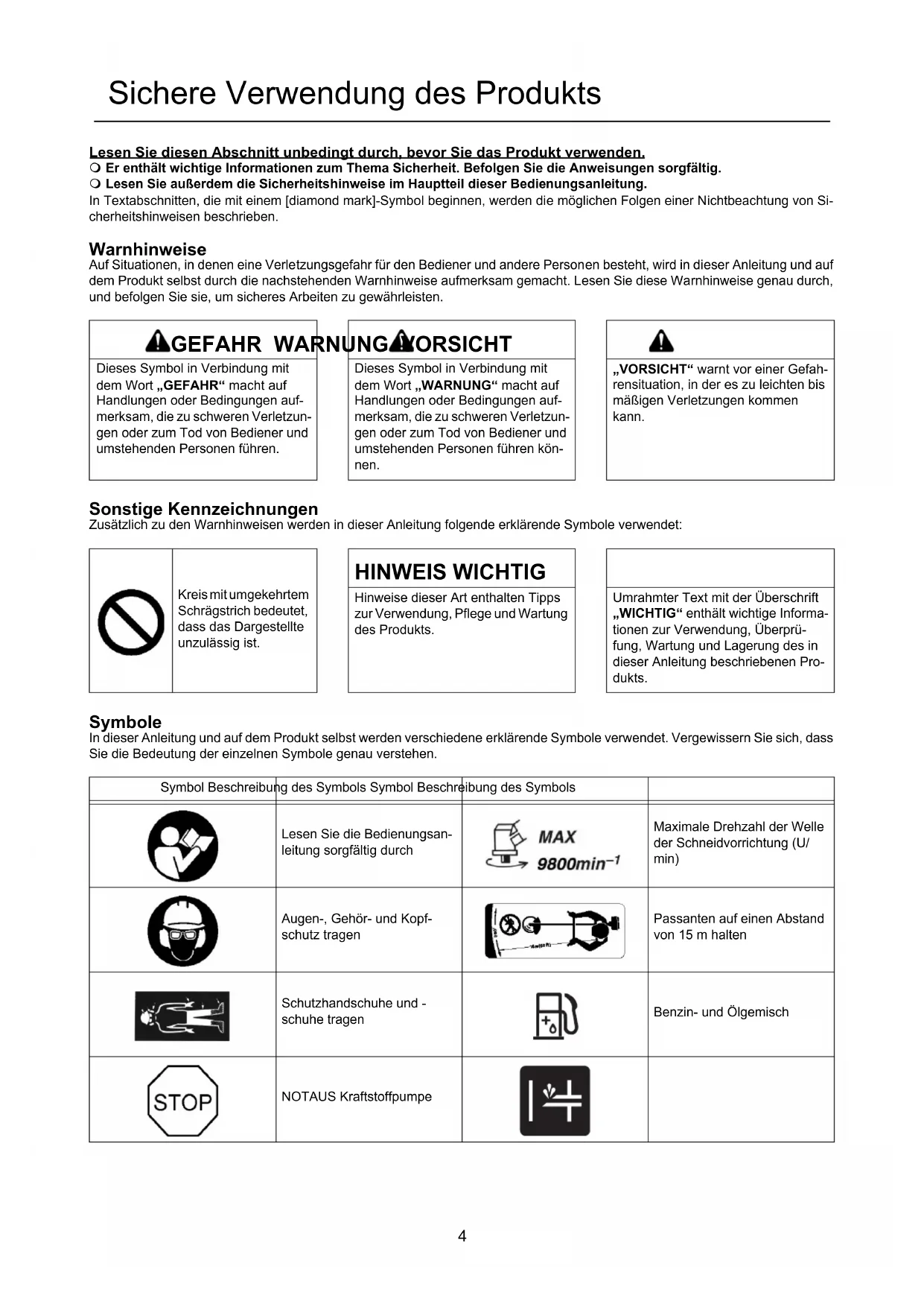 Dieses Symbol in Verbindung mit dem Wort „GEFAHR“ macht auf Handlungen oder Bedingungen auf-merksam, die zu schweren Verletzun-gen oder zum Tod von Bediener und umstehenden Personen führen.Dieses Symbol in Verbindung mit dem Wort „WARNUNG“ macht auf Handlungen oder Bedingungen auf-merksam, die zu schweren Verletzun-gen oder zum Tod von Bediener und umstehenden Personen führen kön- nen. „VORSICHT“ warnt vor einer Gefah-rensituation, in der es zu leichten bis mäßigen Verletzungen kommen kann.Kreis mit umgekehrtem Schrägstrich bedeutet, dass das Dargestellte unzulässig ist. HINWEIS WICHTIG Hinweise dieser Art enthalten Tipps zur Verwendung, Pflege und Wartung des Produkts.Umrahmter Text mit der Überschrift „WICHTIG“ enthält wichtige Informa-tionen zur Verwendung, Überprü-fung, Wartung und Lagerung des in dieser Anleitung beschriebenen Pro-dukts.Symbol Beschreibung des Symbols Symbol Beschreibung des SymbolsLesen Sie die Bedienungsan-leitung sorgfältig durchMaximale Drehzahl der Welle der Schneidvorrichtung (U/ min) Augen-, Gehör- und Kopf-schutz tragenPassanten auf einen Abstand von 15 m haltenSchutzhandschuhe und -schuhe tragenBenzin- und ÖlgemischNOTAUS Kraftstoffpumpe5 Sichere Verwendung des Produkts Warnung! Gegenstände wer- den hochgeschleudert! Vergaserjustierung – Nieder- lastbetrieb Achtung, Seitenschub! Vergaserjustierung – Volllast- betrieb Einsatz ohne Schutzschild verboten Vergaserjustierung – Leer- laufdrehzahl Verwendung von Metallmes- sern verboten U-Griff Verwendung von Nylonfaden- köpfen verboten Rundgriff Nicht in Räumen mit schlech- ter Belüftung verwenden Achtung, heiße Bereiche Achtung, Brandgefahr Garantierter Schallleistungs- pegel Choke-Position bei Kaltstart (Choke geschlossen) Choke-Position bei Betrieb (Choke geöffnet) Achtung, Stromschlag-Gefahr Motorstart Symbol Beschreibung des Symbols Symbol Beschreibung des Symbols6 Sichere Verwendung des Produkts Stelle, an der sich ein Sicherheitsaufkleber befindet Die in dieser Anleitung beschriebenen Produkte sind mit dem unten dargestellten Sicherheitsaufkleber versehen. Machen Sie sich die Bedeutung des Sicherheitsaufklebers bewusst, bevor Sie das Produkt verwenden. Falls der Sicherheitsaufkleber aufgrund von Verschleiß oder Beschädigung nicht mehr lesbar ist oder sich abgelöst hat, erwer- ben Sie bitte einen neuen Sicherheitsaufkleber von Ihrem Händler, und bringen Sie ihn an der nachstehend gezeigten Stelle an. Der Sicherheitsaufkleber muss stets gut lesbar sein. Umgang mit Kraftstoff