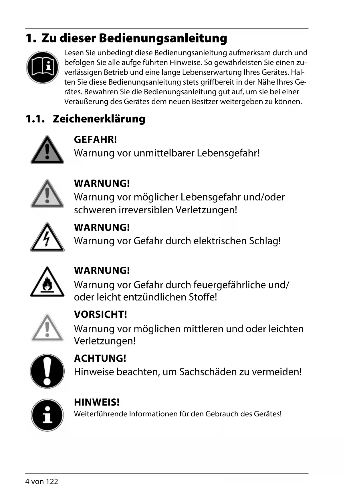 Lesen Sie unbedingt diese Bedienungsanleitung aufmerksam durch und befolgen Sie alle aufge führten Hinweise. So gewährleisten Sie einen zu- verlässigen Betrieb und eine lange Lebenserwartung Ihres Gerätes. Hal- ten Sie diese Bedienungsanleitung stets griffbereit in der Nähe Ihres Ge- rätes. Bewahren Sie die Bedienungsanleitung gut auf, um sie bei einer Veräußerung des Gerätes dem neuen Besitzer weitergeben zu können. 1.1. Zeichenerklärung GEFAHR! Warnung vor unmittelbarer Lebensgefahr! WARNUNG! Warnung vor möglicher Lebensgefahr und/oder schweren irreversiblen Verletzungen! WARNUNG! Warnung vor Gefahr durch elektrischen Schlag! WARNUNG! Warnung vor Gefahr durch feuergefährliche und/ oder leicht entzündlichen Stoffe! VORSICHT! Warnung vor möglichen mittleren und oder leichten Verletzungen! ACHTUNG! Hinweise beachten, um Sachschäden zu vermeiden! HINWEIS! Weiterführende Informationen für den Gebrauch des Gerätes!DE
