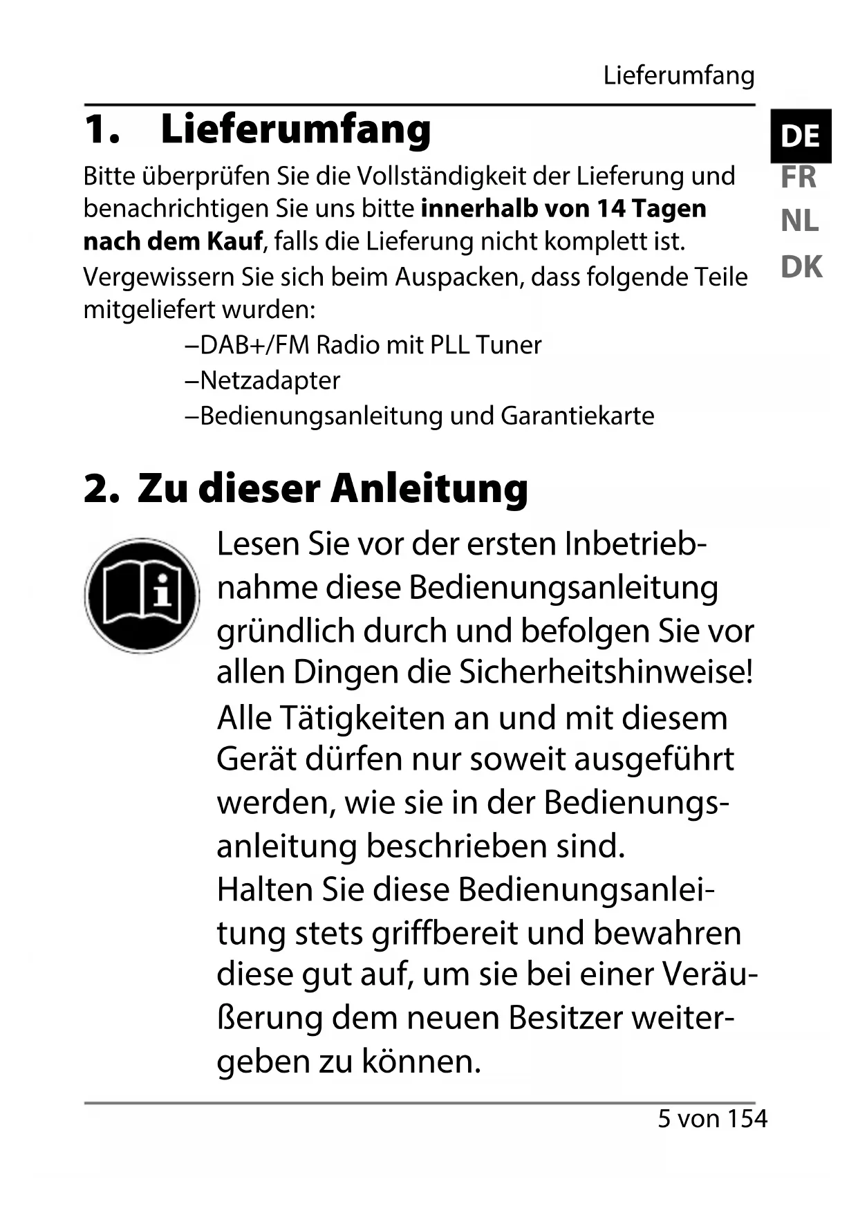 Gebrauch Ihr DAB+/FM Radio mit PLL Tuner dient zur Musik- und Tonwiedergabe von Radiopro- grammen. Das Digital Audio Broadcasting (DAB) ist ein digitaler Übertragungsstandard für terrestri- schen Empfang von Hörfunkprogrammen. Das Gerät ist nur für den privaten und nicht für den industriellen/kommerziellen Ge- brauch bestimmt. Bitte beachten Sie, dass im Falle des nicht be- stimmungsgemäßen Gebrauchs die Haftung erlischt: 43000 ECommerce DE EN FR NL Content final.indb 743000 ECommerce DE EN FR NL Content final.indb 7 08.06.2015 08:51:3708.06.2015 08:51:37Sicherheitshinweise 8 von 154
