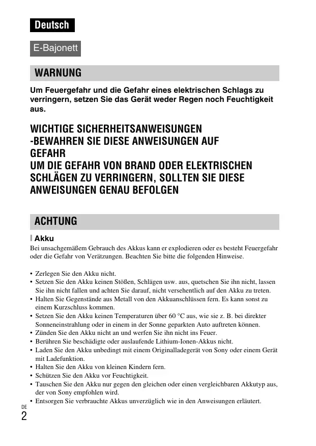 - Zünden Sie den Akku nicht an und werfen Sie ihn nicht ins Feuer.