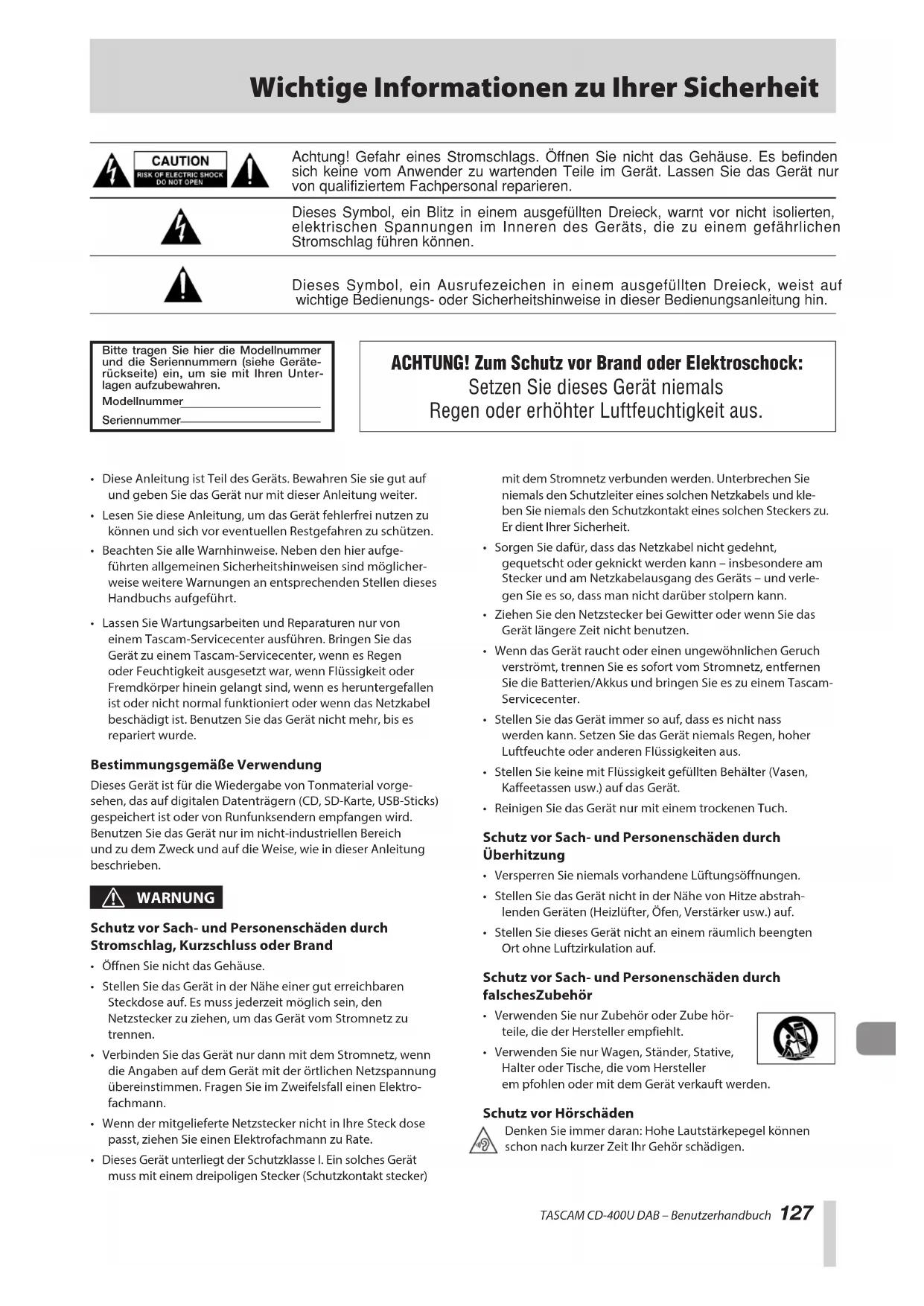 Dieses Symbol, ein Ausrufezeichen in einem ausgefüllten Dreieck, weist auf wichtige Bedienungs- oder Sicherheitshinweise in dieser Bedienungsanleitung hin. Dieses Symbol, ein Blitz in einem ausgefüllten Dreieck, warnt vor nicht isolierten, elektrischen Spannungen im Inneren des Geräts, die zu einem gefährlichen Stromschlag führen können. Achtung! Gefahr eines Stromschlags. Öffnen Sie nicht das Gehäuse. Es befinden sich keine vom Anwender zu wartenden Teile im Gerät. Lassen Sie das Gerät nur von qualifiziertem Fachpersonal reparieren. ACHTUNG! Zum Schutz vor Brand oder Elektroschock: Setzen Sie dieses Gerät niemals Regen oder erhöhter Luftfeuchtigkeit aus. Bitte tragen Sie hier die Modellnummer und die Seriennummern (siehe Geräte-rückseite) ein, um sie mit Ihren Unter-lagen aufzubewahren.ModellnummerSeriennummer• DieseAnleitungistTeildesGeräts.BewahrenSiesiegutaufundgebenSiedasGerätnurmitdieserAnleitungweiter.• LesenSiedieseAnleitung,umdasGerätfehlerfreinutzenzukönnenundsichvoreventuellenRestgefahrenzuschützen.• BeachtenSiealleWarnhinweise.Nebendenhieraufge-führtenallgemeinenSicherheitshinweisensindmöglicher-weiseweitereWarnungenanentsprechendenStellendiesesHandbuchsaufgeführt.• LassenSieWartungsarbeitenundReparaturennurvoneinemTascam-Servicecenterausführen.BringenSiedasGerätzueinemTascam-Servicecenter,wennesRegenoderFeuchtigkeitausgesetztwar,wennFlüssigkeitoderFremdkörperhineingelangtsind,wennesheruntergefallenistodernichtnormalfunktioniertoderwenndasNetzkabelbeschädigtist.BenutzenSiedasGerätnichtmehr,bisesrepariertwurde. Bestimmungsgemäße Verwendung DiesesGerätistfürdieWiedergabevonTonmaterialvorge-sehen,dasaufdigitalenDatenträgern(CD,SD-Karte,USB-Sticks)gespeichertistodervonRunfunksendernempfangenwird.BenutzenSiedasGerätnurimnicht-industriellenBereichundzudemZweckundaufdieWeise,wieindieserAnleitungbeschrieben. V WARNUNG Schutz vor Sach- und Personenschäden durch Stromschlag, Kurzschluss oder Brand