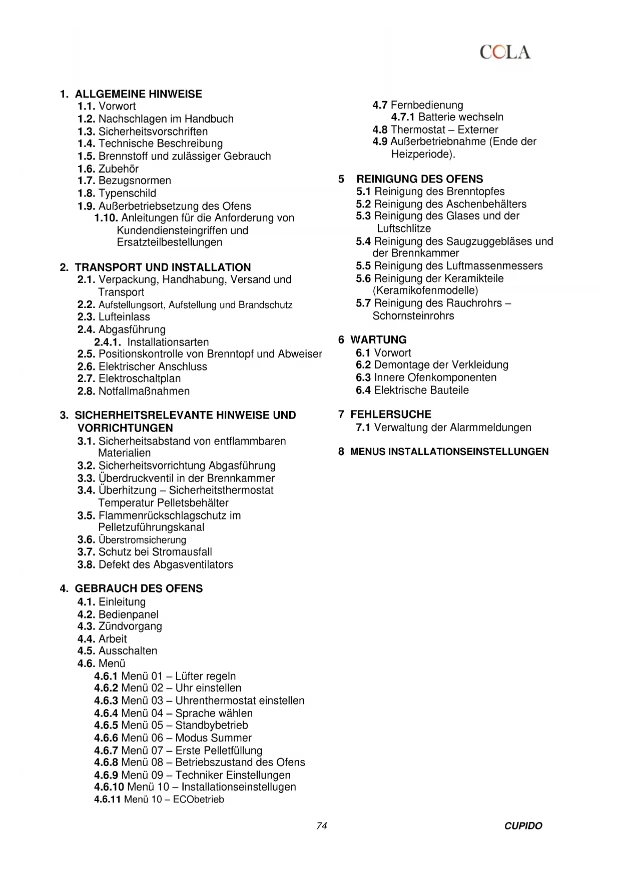 - Vor Installation, Benutzung oder Wartung des Pelletofens die Bedienungs- und Wartungsanleitung lesen. - Die Installation, den elektrischen Anschluss, die Abnahme und Wartung nur von autorisiertem Fachpersonal ausführen lassen. - Den Ofen über ein inspizierbares Endstück an ein vorschriftsmäßiges Schornsteinrohr anschließen; der Anschluss mehrerer Geräte ist nur zulässig, wenn er von den örtlichen Bestimmungen vorgesehen ist und vom Schornsteinfeger genehmigt wurde. - Den Ofen über ein Rohr bzw. einen Außenlufteinlass an den Saugzug anschließen. - Den Ofen an eine vorschriftsmäßige Steckdose mit Spannungswerten 230 V - 50 Hz anschließen. - Die elektrische Anlage und die Steckdosen müssen für die maximale Stromaufnahme des Geräts geeignet sein, die auf dem Etikett und im vorliegenden Handbuch angegeben ist. - Vor jeder Wartung den Stecker aus dem Ofen ziehen und nur am kaltem Ofen Eingriffe vornehmen. - Keine entflammbaren Flüssigkeiten oder Substanzen verwenden, um den Ofen anzuzünden bzw. die Flamme wieder anzufachen: Bei eingeschaltetem Ofen erfolgt das Anzünden der Pellets automatisch. - Der Pelletofen darf ausschließlich mit Pellets beschickt werden, die die in dieser Anleitung beschriebenen Eigenschaften aufweisen. - Der Ofen darf nicht zur Müllverbrennung verwendet werden. - Die Ein- und Auslassöffnungen für die Verbrennungsluft auf keinen Fall schließen oder verdecken. - Während des Ofenbetriebs ist der Umgang mit leicht entflammbaren oder explosiven Stoffen in der Nähe des Ofens untersagt. - Das Schutzgitter des Pelletsbehälters und im Allgemeinen die Sicherheitseinrichtungen nicht entfernen oder verändern. - Der Ofen darf nicht mit offener Feuerraumtür und/oder mit beschädigter oder zerbrochener Glasscheibe betrieben werden. - Während des Betriebs heizt die von der Pelletverbrennung erzeugte intensive Wärme die Außenflächen des Ofens stark auf. Dies gilt besonders für die Feuerraumtür, den Griff und das Rauchrohr. Vermeiden Sie daher jede Berührung mit diesen Teilen ohne entsprechende Schutzausrüstung - Bewahren Sie nicht hitzefeste und/oder entflammbare Gegenstände in ausreichendem Sicherheitsabstand zum Ofen auf. - Den Brenntopf bei jedem Anzünden bzw. Nachfüllen von Pellets reinigen. - Das Rauchrohr und die Zugstabilisatoren in der Brennkammer regelmäßig von einem Fachmann reinigen lassen. - Während des Zündvorgangs und/oder beim normalen Betrieb die Bildung von Rauch und unverbrannten Stoffen vermeiden, die übermäßige Ansammlung von unverbrannten Pellets im Brenntopf muss vor dem erneuten Einschalten von Hand beseitigt werden. - Weisen Sie Kinder und Besucher auf die oben beschriebenen Gefahren hin. - Bei Betriebsstörungen darf der Ofen erst nach Behebung der Problemursache wieder angezündet werden. - Jegliche Änderung und/oder jegliches nicht zulässige Auswechseln mit nicht Original-Ersatzteilen des Ofens ist eine Gefahr für die Benutzer und enthebt den Hersteller von jeder Haftpflicht und strafrechtlichen Verantwortungen. - Ausschließlich die vom Hersteller empfohlenen Ersatzteile benutzen. Der Hersteller haftet nicht für Störungen, Schäden oder Unfälle, die auf die Missachtung bzw. Nichteinhaltung der Hinweise in der Betriebsanleitung zurückzuführen sind.76 CUPIDO