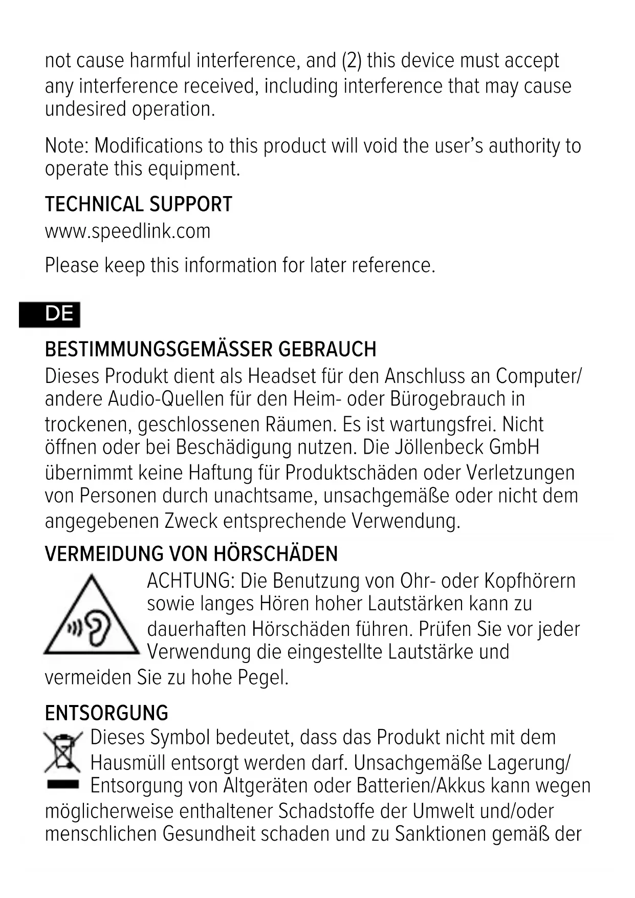 Dieses Produkt dient als Headset für den Anschluss an Computer/ andere Audio-Quellen für den Heim- oder Bürogebrauch in trockenen, geschlossenen Räumen. Es ist wartungsfrei. Nicht önen oder bei Beschädigung nutzen. Die Jöllenbeck GmbH übernimmt keine Haftung für Produktschäden oder Verletzungen von Personen durch unachtsame, unsachgemäße oder nicht dem angegebenen Zweck entsprechende Verwendung.