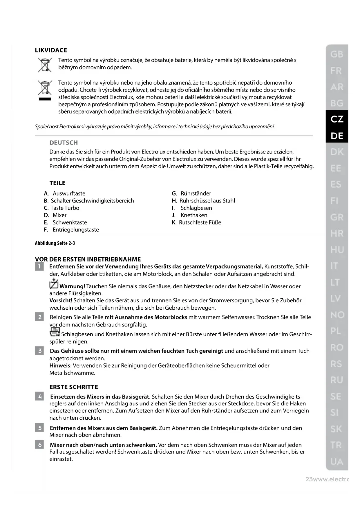 Der Motor verlangsamt sich während des Betriebs. Die Teigmenge überschreitet möglicherweise die maximale Füllmenge. Den Teig entfernen und in zwei Portionen aufteilen. Der Teig ist möglicherweise zu feucht und klebt daher am Schüsselrand. Mehr Mehl hinzugeben, jeweils 1 Teelöel bis der Motor wieder beschleunigt. Solange weiterverarbeiten, bis sich der Teig vom Rand der Schüssel gelöst hat. Der Motor funktioniert nicht. Das Gerät ist nicht an einer Steckdose angeschlossen. Das Gerät vor Betrieb an eine Steckdose anschließen. Das Gerät vibriert/bewegt sich während des Betriebs. Die Gummifüße sind nass. Sicherstellen, dass die Gummifüße auf der Geräteunterseite sauber und trocken sind. Zu hohe Einstellung des Geschwindigkeitswählers. Stellen Sie den Geschwindigkeitswähler niedriger ein. Dies ist normal bei schweren Lebensmitteln (z. B. Teig oder Käse). Lebensmittel entfernen und in zwei Portionen aufteilen. Funktioniert das Gerät immer noch nicht, wenden Sie sich an den Kundendienst. ENTSORGUNG Dieses Symbol auf dem Produkt zeigt an, dass das Gerät eine Batterie enthält, die nicht im normaler Hausmüll entsorgt werden darf. Das Symbol auf dem Produkt oder der Verpackung weist das Gerät als ein Produkt aus, das nicht in den Hausmüll gehört. Bitte entsorgen Sie dieses Gerät an einer entsprechenden Sammelstelle oder bringen es zum Kundendienst von Electrolux, bei dem Batterie als auch elektrische Bauteile sicher und professionell entsorgt werden. Beachten Sie die jeweiligen lokalen Vorschriften für die Entsorgung von Elektrogeräten und wiederauadbaren Batterien. Electrolux behält sich das Recht vor, Produkte, Informationen und Spezikationen zu verändern ohne vorherige Ankündigung.27www.electrolux.com