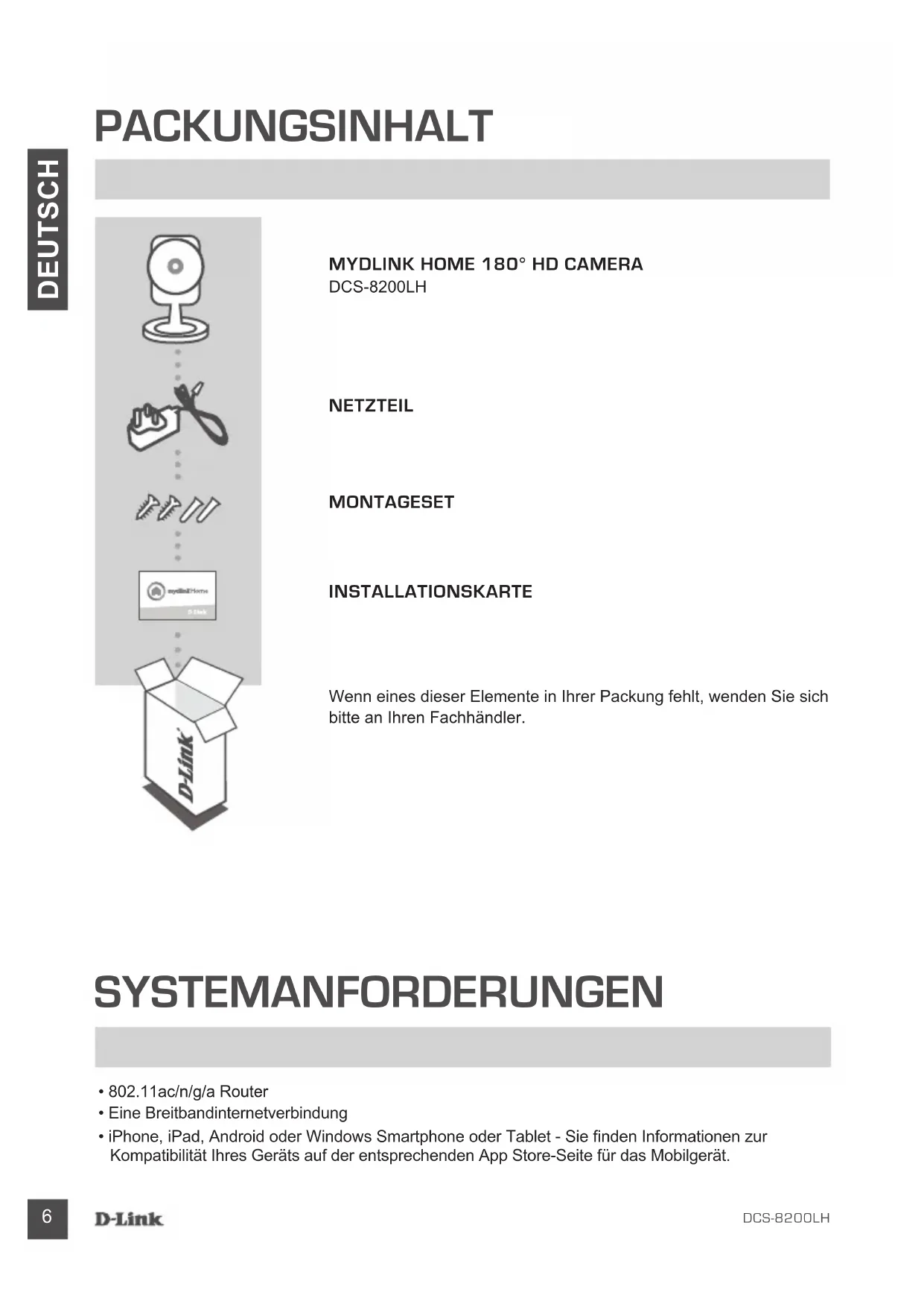 DCS-8200LH MONTAGESET NETZTEIL Wenn eines dieser Elemente in Ihrer Packung fehlt, wenden Sie sich bitte an Ihren Fachhändler. INSTALLATIONSKARTE SYSTEMANFORDERUNGEN