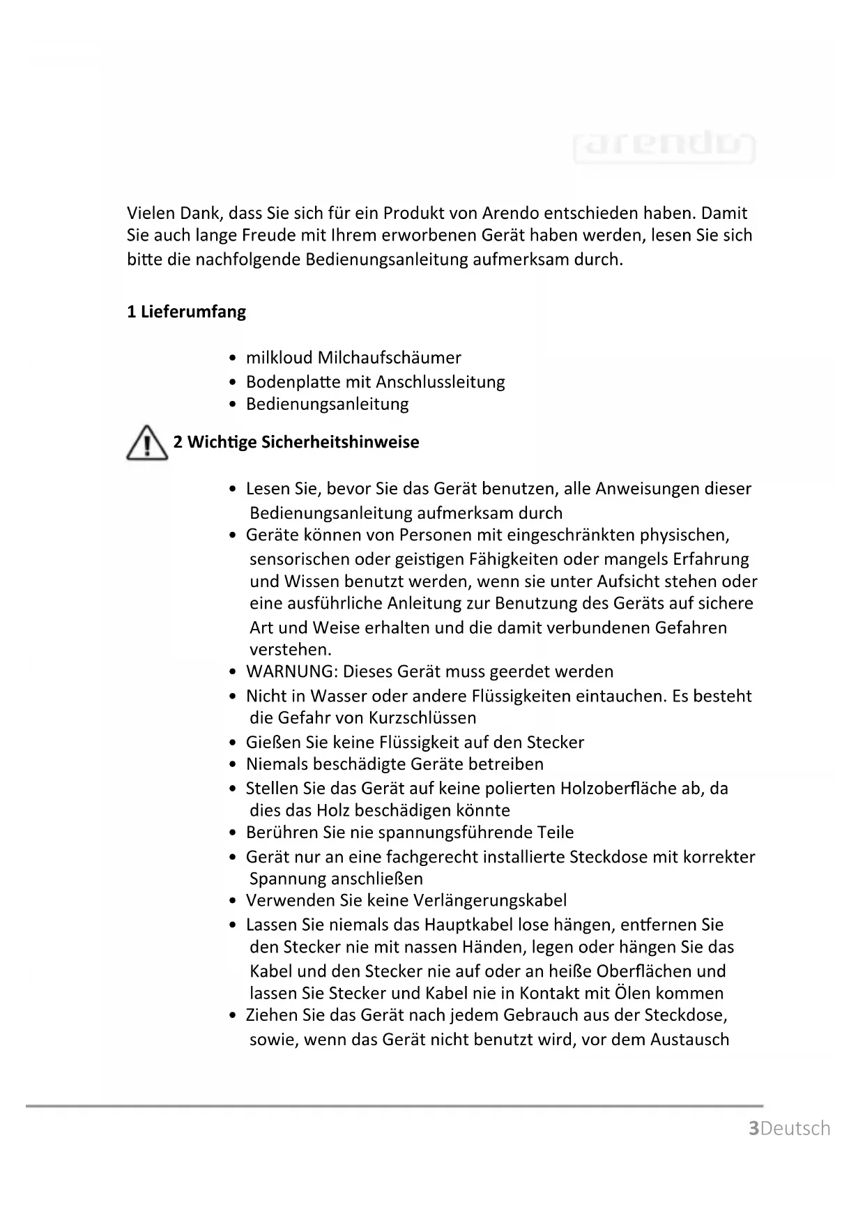 - No limpie el aparato en el lavavajillas!3Deutsch Vielen Dank, dass Sie sich für ein Produkt von Arendo entschieden haben. Damit Sie auch lange Freude mit Ihrem erworbenen Gerät haben werden, lesen Sie sich bie die nachfolgende Bedienungsanleitung aufmerksam durch. 1 Lieferumfang