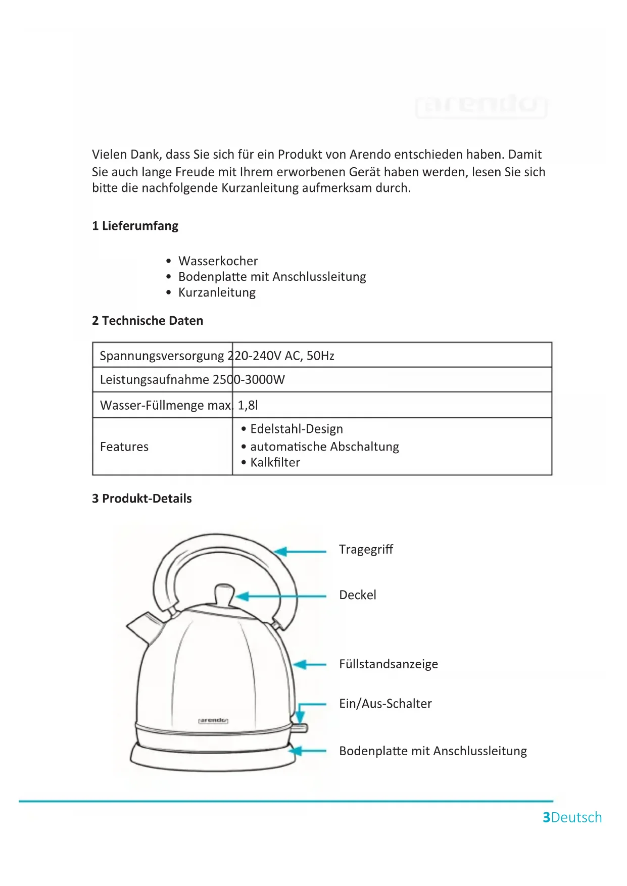 - Während des Betriebs wird das Gehäuse des Wasserkochers heiß. Fassen Sie den Wasserkocher nur an den dafür vorgesehenen Tragegri an. 8 Sicherheitshinweise und Haungsausschluss Versuchen Sie bie nie das Gerät zu önen, um eigenständig Reparaturen oder Umbauten vorzunehmen. Vermeiden Sie den Kontakt zu den Netzspannungen. Das Gerät ist nur bei gezogenem Stecker spannungsfrei. Schließen Sie bie das Produkt auch nicht kurz. Vergessen Sie außerdem nicht, den Netzstecker bei Nichtgebrauch oder Gewier vollständig herauszuziehen. Das Gerät ist nicht für den Betrieb im Freien zugelassen. Bie verwenden Sie es daher ausschließlich im trockenen Bereich. Schützen Sie es vor hoher Lufeuchg- keit, Wasser und Schnee.7Deutsch Halten Sie unbedingt das Gerät von hohen Außentemperaturen fern. Setzen Sie das Gerät keinen plötzlichen Temperaturwechseln oder starken Vibra- onen aus, da dies die Elektronikteile beschädigen könnte. Prüfen Sie vor der Verwendung das Gerät auf eventuelle Beschädigungen. Das Gerät sollte nicht benutzt werden, wenn es einen Stoß abbekommen hat oder in anderer Form beschädigt worden ist. Beachten Sie bie auch die naonalen Besmmungen und Beschränkungen. Nutzen Sie das Gerät nicht für andere Zwecke als die, die in der dieser Anleitung beschrieben sind. Dieses Produkt ist kein Spielzeug. Bewahren Sie es außerhalb der Reichweite von Kindern oder geisg beeinträchgten Personen auf. Jede Reparatur oder Veränderung am Gerät, die nicht vom ursprünglichen Liefer- anten durchgeführt wird, führt zum Erlöschen der Gewährleistungs- bzw. Garan- eansprüche. Das Gerät darf nur von Personen benutzt werden, die diese Anleitung gelesen und verstanden haben. Die Gerätespezikaonen können sich ändern, ohne dass vor- her gesondert darauf hingewiesen wurde. Das Gerät darf nur von Personen be- nutzt werden, die diese Anleitung gelesen und verstanden haben. 9 Entsorgungshinweise Elektrische und elektronische Geräte dürfen nach der europäischen WEEE Richtlin- ie nicht mit dem Hausmüll entsorgt werden. Deren Bestandteile müssen getrennt der Wiederverwertung oder Entsorgung zugeführt werden, weil giige und gefähr- liche Bestandteile bei unsachgemäßer Entsorgung die Umwelt nachhalg schädi- gen können. Sie sind als Verbraucher nach dem Elektro- und Elektronikgerätege- setz (ElektroG) verpichtet, elektrische und elektronische Geräte am Ende ihrer Lebensdauer an den Hersteller, die Verkaufsstelle oder an dafür eingerichtete, öentliche Sammelstellen kostenlos zurückgeben. Einzelheiten dazu regelt das jeweilige Landesrecht. Das Symbol auf dem Produkt, der Betriebsanleitung oder/ und der Verpackung weist auf diese Besmmungen hin. Mit dieser Art der Sto- trennung, Verwertung und Entsorgung von Altgeräten leisten Sie einen wichgen Beitrag zum Schutz unserer Umwelt.8 Deutsch Hiermit erklärt die Firma WD Plus GmbH, dass sich die Geräte 300718, 300719,300720, 300721, 300722 und 300723 in Übereinsmmung mit den grundlegenden Anforderungen und den übrigen einschlägigen Besmmungen benden. Eine vollständige Konformitätserklärung erhalten Sie unter: WD Plus GmbH, Wohlenbergstraße 16, 30179 Hannover WEEE Richtlinie 2012/19/EU WEEE Register-Nr: DE 944956689English Thank you for having chosen this Arendo product and for placing your trust in our company. Please read this manual carefully before installaon to ensure your long- term enjoyment of this product. For future reference, please keep this manual. 1 Scope of delivery