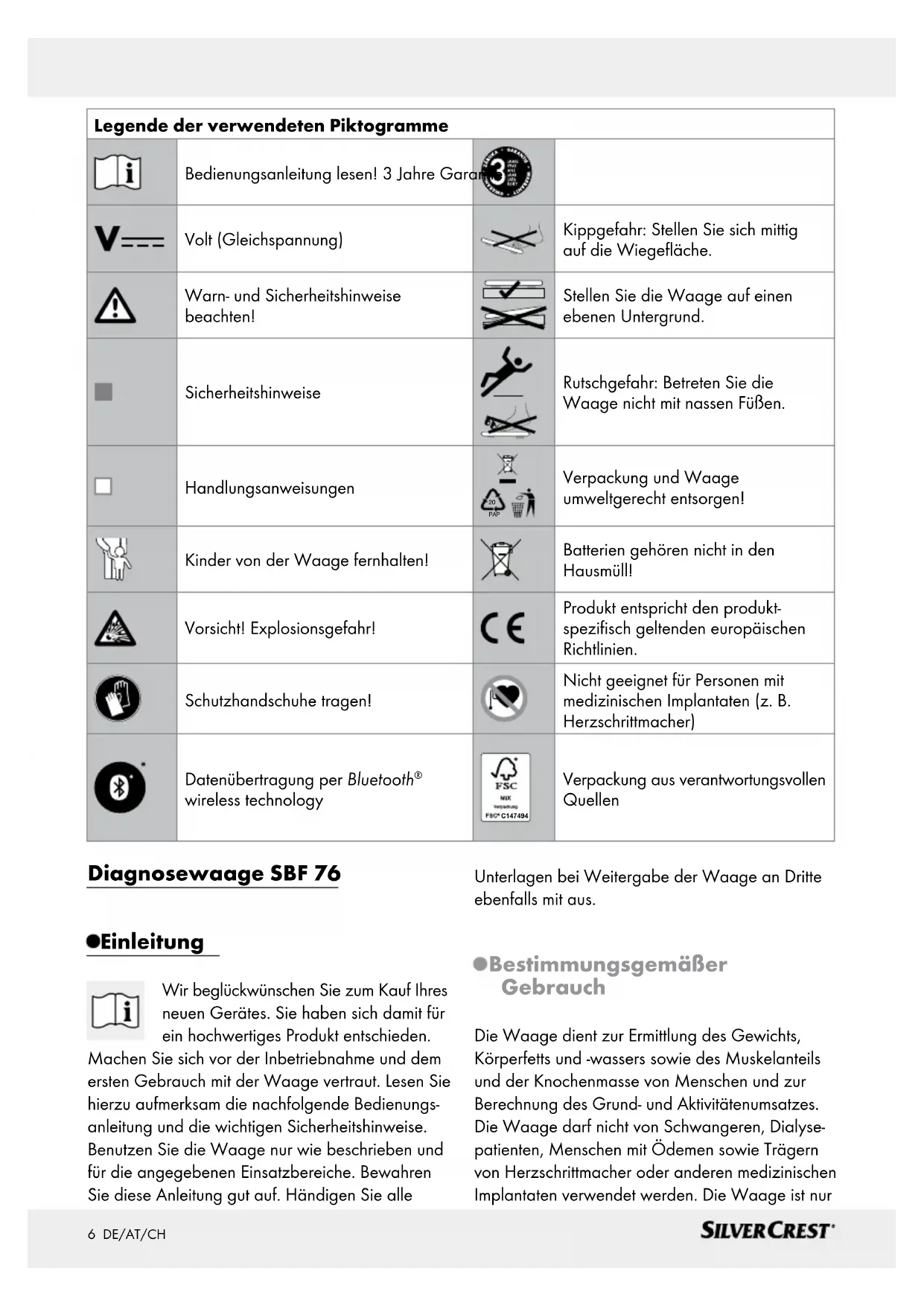 wireless technology C147494 Verpackung aus verantwortungsvollen Quellen Diagnosewaage SBF 76 Einleitung Wir beglückwünschen Sie zum Kauf Ihres neuen Gerätes. Sie haben sich damit für ein hochwertiges Produkt entschieden. Machen Sie sich vor der Inbetriebnahme und dem ersten Gebrauch mit der Waage vertraut. Lesen Sie hierzu aufmerksam die nachfolgende Bedienungs- anleitung und die wichtigen Sicherheitshinweise. Benutzen Sie die Waage nur wie beschrieben und für die angegebenen Einsatzbereiche. Bewahren Sie diese Anleitung gut auf. Händigen Sie alle Unterlagen bei Weitergabe der Waage an Dritte ebenfalls mit aus. Bestimmungsgemäßer Gebrauch Die Waage dient zur Ermittlung des Gewichts, Körperfetts und -wassers sowie des Muskelanteils und der Knochenmasse von Menschen und zur Berechnung des Grund- und Aktivitätenumsatzes. Die Waage darf nicht von Schwangeren, Dialyse- patienten, Menschen mit Ödemen sowie Trägern von Herzschrittmacher oder anderen medizinischen Implantaten verwendet werden. Die Waage ist nur7 DE/AT/CH zur Eigenanwendung und nicht für den kommerziellen Gebrauch vorgesehen. Eine andere Verwendung als zuvor beschrieben oder eine Veränderung der Waage ist nicht zulässig und kann zu Verletzungen und / oder Beschädigungen der Waage führen. Für Schäden, deren Ursachen in bestimmungswidriger Anwendung liegen, übernimmt der Hersteller keine Haftung. Die Waage ist nicht für den gewerblichen Einsatz bestimmt. Hinweis: Die Messungen und Empfehlungen besitzen keine medizinische Relevanz. Falls sich Ihr Körperfett- und –wasseranteil dauerhaft über oder unter dem Normalbereich befindet, suchen Sie bitte einen Arzt auf. Teilebeschreibung