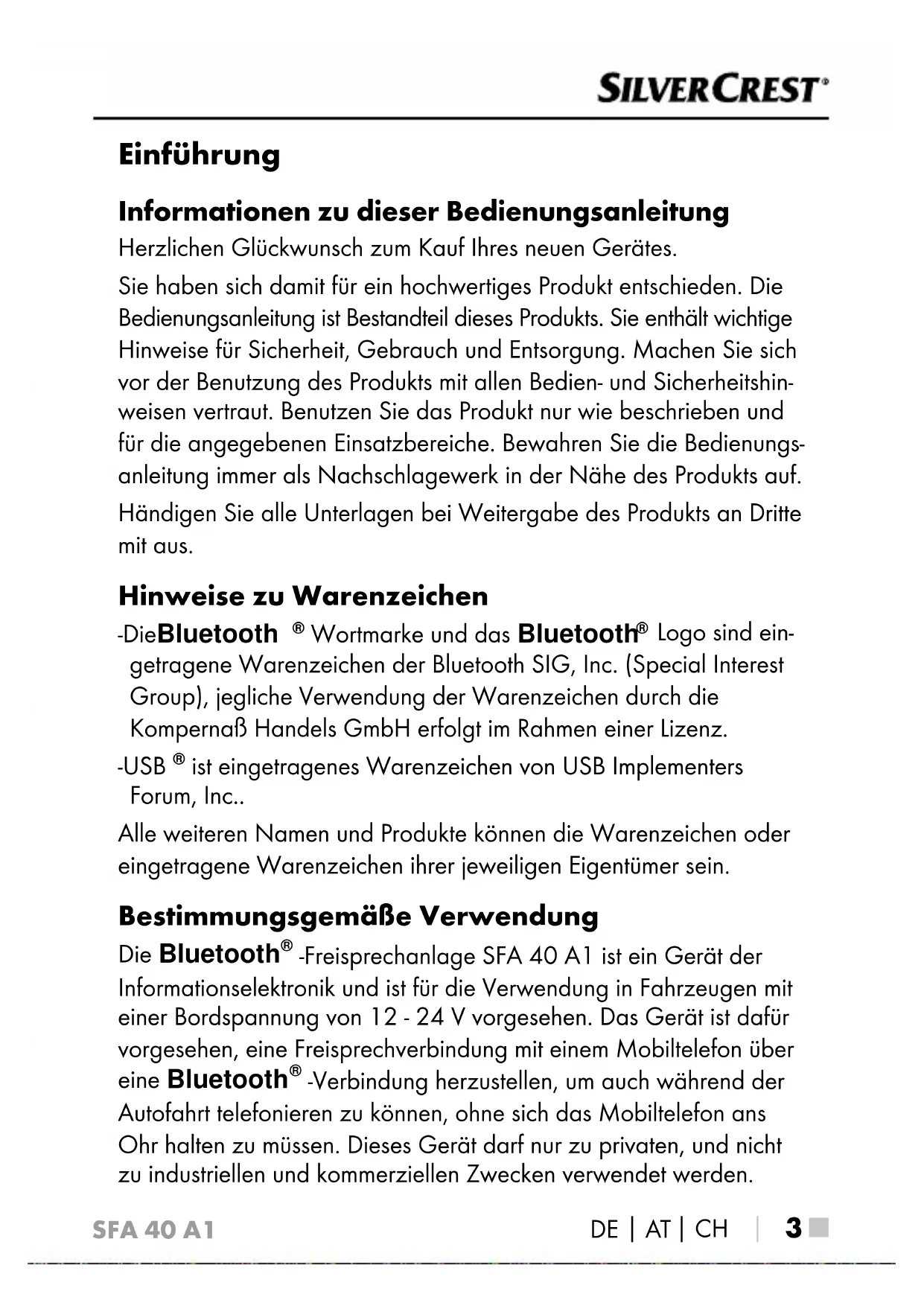 -Freisprechanlage SFA 40 A1 ist ein Gerät der Informationselektronik und ist für die Verwendung in Fahrzeugen mit einer Bordspannung von 12 - 24 V vorgesehen. Das Gerät ist dafür vorgesehen, eine Freisprechverbindung mit einem Mobiltelefon über eine Bluetooth