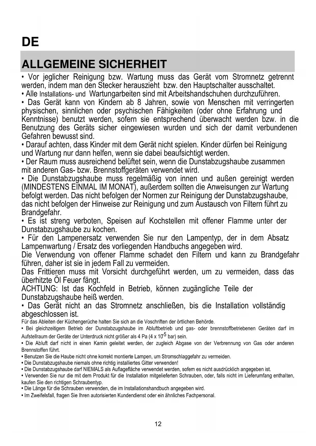- Bei gleichzeitigem Betrieb der Dunstabzugshaube im Abluftbetrieb und gas- oder brennstoffbetriebenen Geräten darf im Aufstellraum der Geräte der Unterdruck nicht größer als 4 Pa (4 x 10-5 bar) sein.