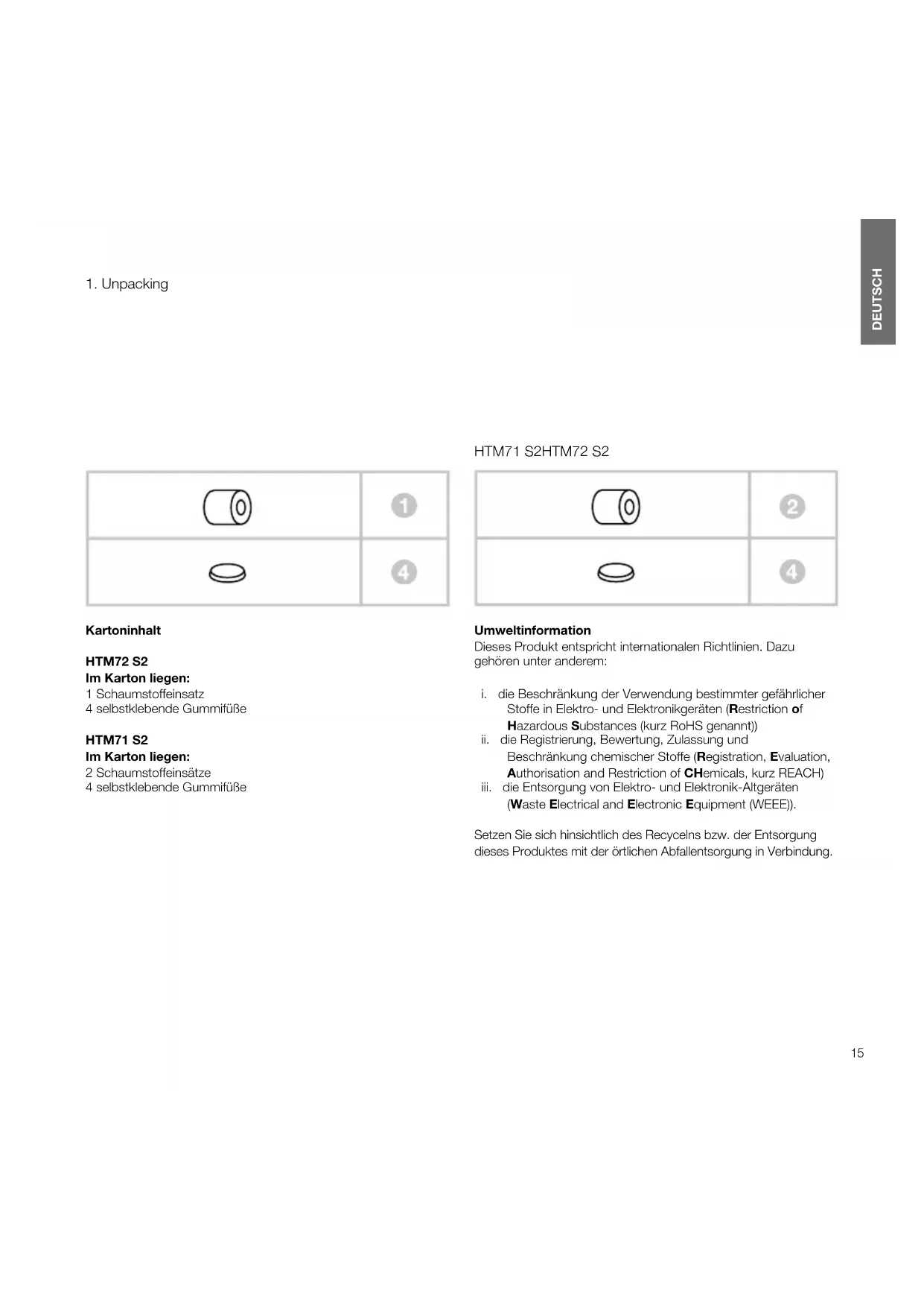 Kartoninhalt HTM72S2 Im Karton liegen: 1 Schaumstoffeinsatz 4 selbstklebende Gummifüße HTM71S2 Im Karton liegen: 2 Schaumstoffeinsätze 4 selbstklebende Gummifüße Umweltinformation Dieses Produkt entspricht internationalen Richtlinien. Dazu gehören unter anderem: