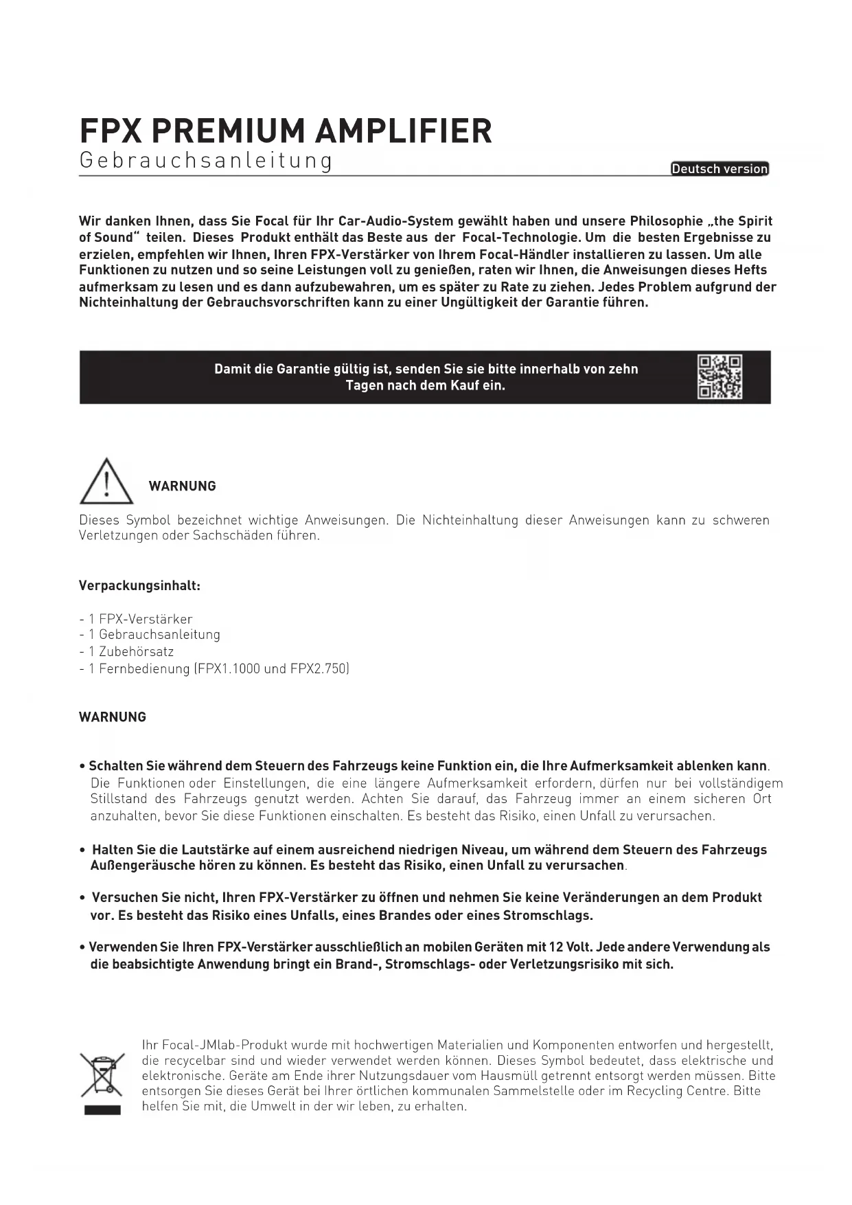 Gebrauchsanleitung Ihr Focal-JMlab-Produkt wurde mit hochwertigen Materialien und Komponenten entworfen und hergestellt, die recycelbar sind und wieder verwendet werden können. Dieses Symbol bedeutet, dass elektrische und elektronische. Geräte am Ende ihrer Nutzungsdauer vom Hausmüll getrennt entsorgt werden müssen. Bitte entsorgen Sie dieses Gerät bei Ihrer örtlichen kommunalen Sammelstelle oder im Recycling Centre. Bitte helfen Sie mit, die Umwelt in der wir leben, zu erhalten. Wir danken Ihnen, dass Sie Focal für Ihr Car-Audio-System gewählt haben und unsere Philosophie „the Spirit of Sound“ teilen. Dieses Produkt enthält das Beste aus der Focal-Technologie. Um die besten Ergebnisse zu erzielen, empfehlen wir Ihnen, Ihren FPX-Verstärker von Ihrem Focal-Händler installieren zu lassen. Um alle Funktionen zu nutzen und so seine Leistungen voll zu genießen, raten wir Ihnen, die Anweisungen dieses Hefts aufmerksam zu lesen und es dann aufzubewahren, um es später zu Rate zu ziehen. Jedes Problem aufgrund der Nichteinhaltung der Gebrauchsvorschriften kann zu einer Ungültigkeit der Garantie führen. Damit die Garantie gültig ist, senden Sie sie bitte innerhalb von zehn Tagen nach dem Kauf ein. WARNUNG Dieses Symbol bezeichnet wichtige Anweisungen. Die Nichteinhaltung dieser Anweisungen kann zu schweren Verletzungen oder Sachschäden führen. Verpackungsinhalt: - 1 FPX-Verstärker - 1 Gebrauchsanleitung - 1 Zubehörsatz - 1 Fernbedienung (FPX1.1000 und FPX2.750) WARNUNG