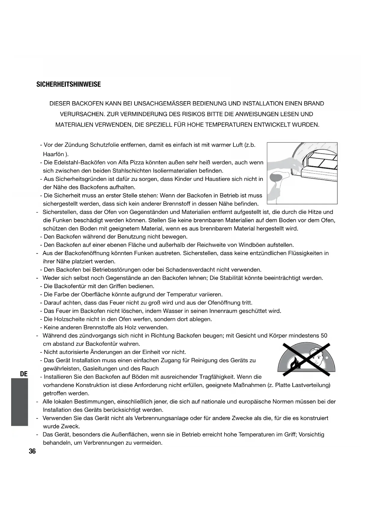 SICHERHEITSHINWEISE DIESER BACKOFEN KANN BEI UNSACHGEMÄSSER BEDIENUNG UND INSTALLATION EINEN BRAND VERURSACHEN. ZUR VERMINDERUNG DES RISIKOS BITTE DIE ANWEISUNGEN LESEN UND MATERIALIEN VERWENDEN, DIE SPEZIELL FÜR HOHE TEMPERATUREN ENTWICKELT WURDEN. - Vor der Zündung Schutzfolie entfernen, damit es einfach ist mit warmer Luft (z.b. Haarfön ). - Die Edelstahl-Backöfen von Alfa Pizza könnten außen sehr heiß werden, auch wenn sich zwischen den beiden Stahlschichten Isoliermaterialien benden. - Aus Sicherheitsgründen ist dafür zu sorgen, dass Kinder und Haustiere sich nicht in der Nähe des Backofens aufhalten. - Die Sicherheit muss an erster Stelle stehen: Wenn der Backofen in Betrieb ist muss sichergestellt werden, dass sich kein anderer Brennsto in dessen Nähe benden. - Sicherstellen, dass der Ofen von Gegenständen und Materialien entfernt aufgestellt ist, die durch die Hitze und die Funken beschädigt werden können. Stellen Sie keine brennbaren Materialien auf dem Boden vor dem Ofen, schützen den Boden mit geeignetem Material, wenn es aus brennbarem Material hergestellt wird. - Den Backofen während der Benutzung nicht bewegen. - Den Backofen auf einer ebenen Fläche und außerhalb der Reichweite von Windböen aufstellen. - Aus der Backofenönung könnten Funken austreten. Sicherstellen, dass keine entzündlichen Flüssigkeiten in ihrer Nähe platziert werden. - Den Backofen bei Betriebsstörungen oder bei Schadensverdacht nicht verwenden. - Weder sich selbst noch Gegenstände an den Backofen lehnen; Die Stabilität könnte beeinträchtigt werden. - Die Backofentür mit den Grien bedienen. - Die Farbe der Oberäche könnte aufgrund der Temperatur variieren. - Darauf achten, dass das Feuer nicht zu groß wird und aus der Ofenönung tritt. - Das Feuer im Backofen nicht löschen, indem Wasser in seinen Innenraum geschüttet wird. - Die Holzscheite nicht in den Ofen werfen, sondern dort ablegen. - Keine anderen Brennstoe als Holz verwenden. - Während des zündvorgangs sich nicht in Richtung Backofen beugen; mit Gesicht und Körper mindestens 50 cm abstand zur Backofentür wahren. - Nicht autorisierte Änderungen an der Einheit vor nicht. - Das Gerät Installation muss einen einfachen Zugang für Reinigung des Geräts zu gewährleisten, Gasleitungen und des Rauch - Installieren Sie den Backofen auf Böden mit ausreichender Tragfähigkeit. Wenn die vorhandene Konstruktion ist diese Anforderung nicht erfüllen, geeignete Maßnahmen (z. Platte Lastverteilung) getroen werden. - Alle lokalen Bestimmungen, einschließlich jener, die sich auf nationale und europäische Normen müssen bei der Installation des Geräts berücksichtigt werden. - Verwenden Sie das Gerät nicht als Verbrennungsanlage oder für andere Zwecke als die, für die es konstruiert wurde Zweck. - Das Gerät, besonders die Außenächen, wenn sie in Betrieb erreicht hohe Temperaturen im Gri; Vorsichtig behandeln, um Verbrennungen zu vermeiden.37