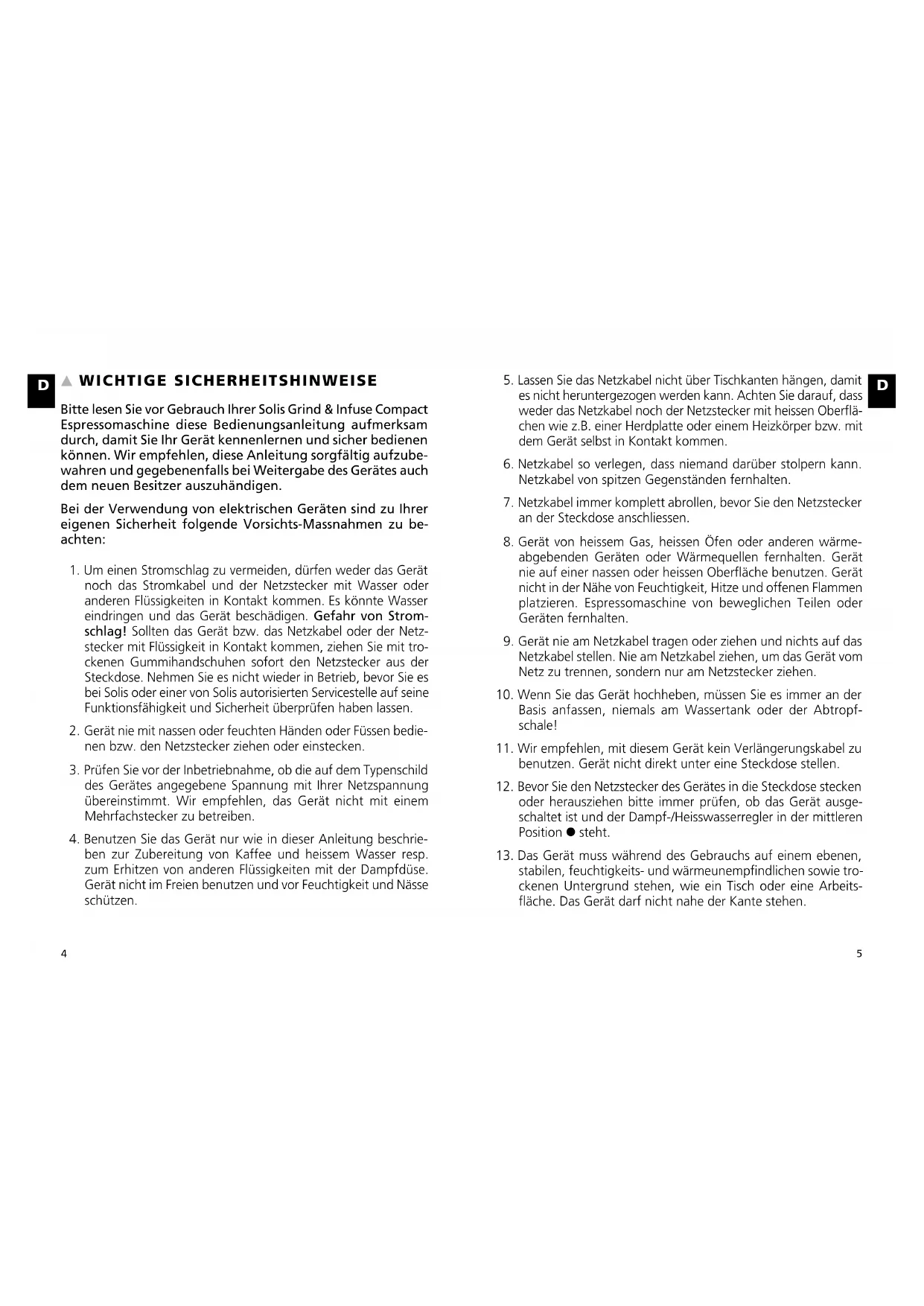WICHTIGE SICHERHEITSHINWEISE Bitte lesen Sie vor Gebrauch Ihrer Solis Grind & Infuse Compact Espressomaschine diese Bedienungsanleitung aufmerksam durch, damit Sie Ihr Gerät kennenlernen und sicher bedienen können. Wir empfehlen, diese Anleitung sorgfältig aufzube- wahren und gegebenenfalls bei Weitergabe des Gerätes auch dem neuen Besitzer auszuhändigen. Bei der Verwendung von elektrischen Geräten sind zu Ihrer eigenen Sicherheit folgende Vorsichts-Massnahmen zu be- achten: