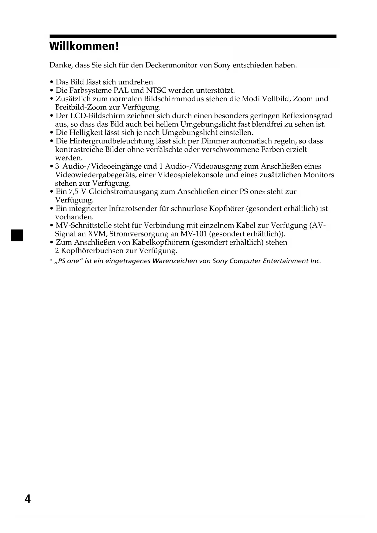 - The fuse has blown. Press the (VOL)(+) or (ATT) on the card remote commander. This may be caused by local interference such as a car engine or motorcycle. Adjust the antennas for minimum interference. The cord has been disconnected. Connect the cord securely. The battery may be exhausted.2 Entsorgung von gebrauchten elektrischen und elektronischen Geräten (anzuwenden in den Ländern der Europäischen Union und anderen europäischen Ländern mit einem separaten Sammelsystem für diese Geräte) Das Symbol auf dem Produkt oder seiner Verpackung weist darauf hin, dass dieses Produkt nicht als normaler Haushaltsabfall zu behandeln ist, sondern an einer Annahmestelle für das Recycling von elektrischen und elektronischen Geräten abgegeben werden muss. Durch Ihren Beitrag zum korrekten Entsorgen dieses Produkts schützen Sie die Umwelt und die Gesundheit Ihrer Mitmenschen. Umwelt und Gesundheit werden durch falsches Entsorgen gefährdet. Materialrecycling hilft, den Verbrauch von Rohstoffen zu verringern. Weitere Informationen über das Recycling dieses Produkts erhalten Sie von Ihrer Gemeinde, den kommunalen Entsorgungsbetrieben oder dem Geschäft, in dem Sie das Produkt gekauft haben. Geeignetes Zubehör: Fernbedienung3 Inhalt Willkommen! ....................................................................................................................... 4 Sicherheitsmaßnahmen ...................................................................................................... 5 Lage und Funktion der Teile und Bedienelemente ........................................................ 7 Betrieb Öffnen des Anzeigemonitors ............................................................................................ 9 Auswählen der Eingangsquelle ...................................................................................... 10 Einstellen des Bildschirmmodus .................................................................................... 11 Ändern der Anzeigeeinstellungen ................................................................................. 12 Einstellen der Lautstärke ................................................................................................. 14 Anschlüsse Installationsdiagramm ..................................................................................................... 15 Anschlussdiagramm......................................................................................................... 16 Weitere Informationen Wartung .............................................................................................................................. 18 Technische Daten .............................................................................................................. 20 Störungsbehebung ............................................................................................................ 214 Willkommen! Danke, dass Sie sich für den Deckenmonitor von Sony entschieden haben.