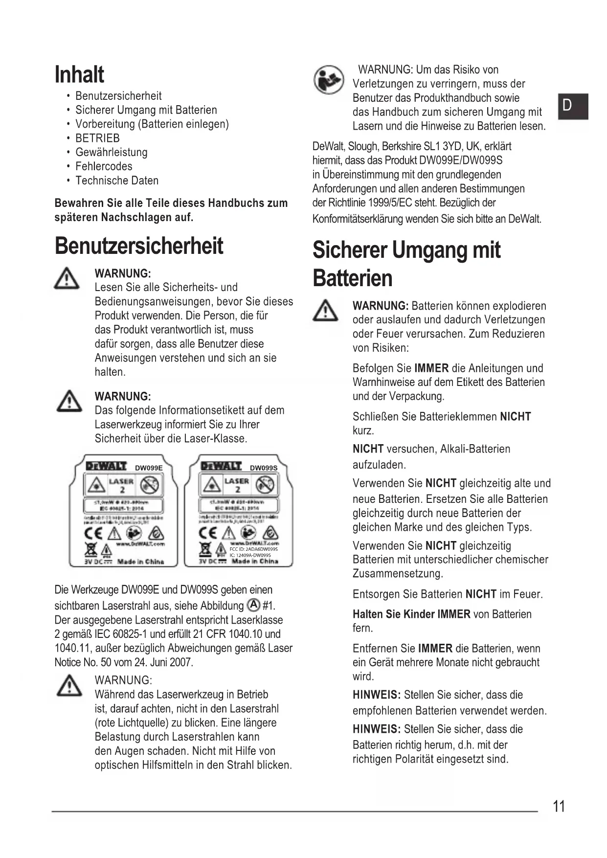 #1. Der ausgegebene Laserstrahl entspricht Laserklasse 2 gemäß IEC 60825-1 und erfüllt 21 CFR 1040.10 und 1040.11, außer bezüglich Abweichungen gemäß Laser Notice No. 50 vom 24. Juni 2007. WARNUNG: Während das Laserwerkzeug in Betrieb ist, darauf achten, nicht in den Laserstrahl (rote Lichtquelle) zu blicken. Eine längere Belastung durch Laserstrahlen kann den Augen schaden. Nicht mit Hilfe von optischen Hilfsmitteln in den Strahl blicken. WARNUNG: Um das Risiko von Verletzungen zu verringern, muss der Benutzer das Produkthandbuch sowie das Handbuch zum sicheren Umgang mit Lasern und die Hinweise zu Batterien lesen. DeWalt, Slough, Berkshire SL1 3YD, UK, erklärt hiermit, dass das Produkt DW099E/DW099S in Übereinstimmung mit den grundlegenden Anforderungen und allen anderen Bestimmungen der Richtlinie 1999/5/EC steht. Bezüglich der Konformitätserklärung wenden Sie sich bitte an DeWalt. Sicherer Umgang mit Batterien WARNUNG: Batterien können explodieren oder auslaufen und dadurch Verletzungen oder Feuer verursachen. Zum Reduzieren von Risiken: Befolgen Sie IMMER die Anleitungen und Warnhinweise auf dem Etikett des Batterien und der Verpackung. Schließen Sie Batterieklemmen NICHT kurz. NICHT versuchen, Alkali-Batterien aufzuladen. Verwenden Sie NICHT gleichzeitig alte und neue Batterien. Ersetzen Sie alle Batterien gleichzeitig durch neue Batterien der gleichen Marke und des gleichen Typs. Verwenden Sie NICHT gleichzeitig Batterien mit unterschiedlicher chemischer Zusammensetzung. Entsorgen Sie Batterien NICHT im Feuer. Halten Sie Kinder IMMER von Batterien fern. Entfernen Sie IMMER die Batterien, wenn ein Gerät mehrere Monate nicht gebraucht wird. HINWEIS: Stellen Sie sicher, dass die empfohlenen Batterien verwendet werden. HINWEIS: Stellen Sie sicher, dass die Batterien richtig herum, d.h. mit der richtigen Polarität eingesetzt sind.