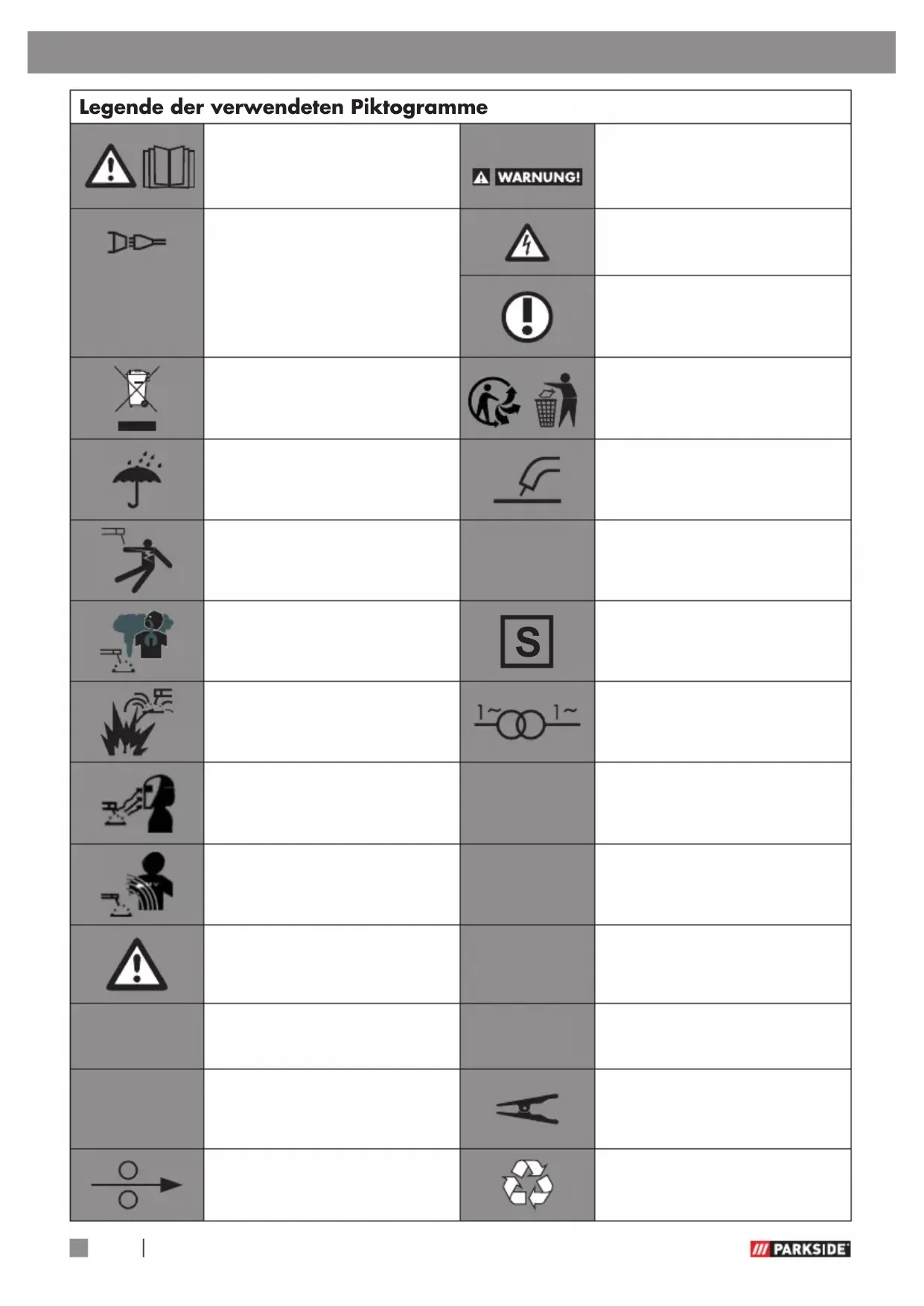 DE/AT/CH Legende der verwendeten Piktogramme .........................................Seite 6 Einleitung ..........................................................................................................Seite 7 Bestimmungsgemäße Verwendung ...........................................................................Seite 7 Lieferumfang .........................................................................................................Seite 7 Teilebeschreibung ..................................................................................................Seite 8 Technische Daten ...................................................................................................Seite 8 Sicherheitshinweise .....................................................................................Seite 8 Gefahrenquellen beim Lichtbogenschweißen .............................................................Seite 10 Schweißschirmspezifische Sicherheitshinweise...........................................................Seite 13 Umgebung mit erhöhter elektrischer Gefährdung .......................................................Seite 14 Schweißen in engen Räumen ..................................................................................Seite 15 Summierung der Leerlaufspannungen .......................................................................Seite 16 Verwendung von Schulterschlingen. .........................................................................Seite 16 Schutzkleidung ......................................................................................................Seite 16 Schutz gegen Strahlen und Verbrennungen ...............................................................Seite 17 EMV-Geräteklassifizierung ......................................................................................Seite 17 Vor der Inbetriebnahme ............................................................................Seite 18 Montage ............................................................................................................Seite 18 Schweißschutzschild montieren ................................................................................Seite 18 Fülldraht einsetzen .................................................................................................Seite 18 Inbetriebnahme .............................................................................................Seite 20 Gerät ein- und ausschalten ......................................................................................Seite 20 Schweißstrom einstellen ..........................................................................................Seite 20 Drahtvorschub einstellen .........................................................................................Seite 20 Schweißen ............................................................................................................Seite 21 Schweißnaht erzeugen ...........................................................................................Seite 22 Wartung und Reinigung ............................................................................Seite 23 Umwelthinweise und Entsorgungsangaben ....................................Seite 24 EU-Konformitätserklärung .......................................................................Seite 24 Hinweise zu Garantie und Serviceabwicklung ..............................Seite 25 Garantiebedingungen ............................................................................................Seite 25 Garantiezeit und gesetzliche Mängelansprüche .........................................................Seite 25 Garantieumfang ....................................................................................................Seite 25 Abwicklung im Garantiefall .....................................................................................Seite 25 Service................................................................................................................Seite 26 Inhaltsverzeichnis6 DE/AT/CH Legende der verwendeten Piktogramme Legende der verwendeten Piktogramme Vorsicht! Betriebsanleitung lesen! Schwere bis tödliche Verletzungen möglich! Netzeingang; Anzahl der Phasen sowie Vorsicht! Stromschlaggefahr! 1 ~ 50 Hz Wechselstromsymbol und Bemessungswert der Fre- quenz. Wichtiger Hinweis! Entsorgen Sie Elektrogeräte nicht über den Hausmüll! Entsorgen Sie Verpackung und Gerät umweltgerecht! Verwenden Sie das Gerät nicht im Freien und nie bei Regen! Selbstschützendes Fülldrahtschweißen. Elektrischer Schlag von der Schweißelektrode kann tödlich sein! IP21SSchutzart. Einatmen von Schweiß- rauch kann Ihre Gesundheit gefährden.