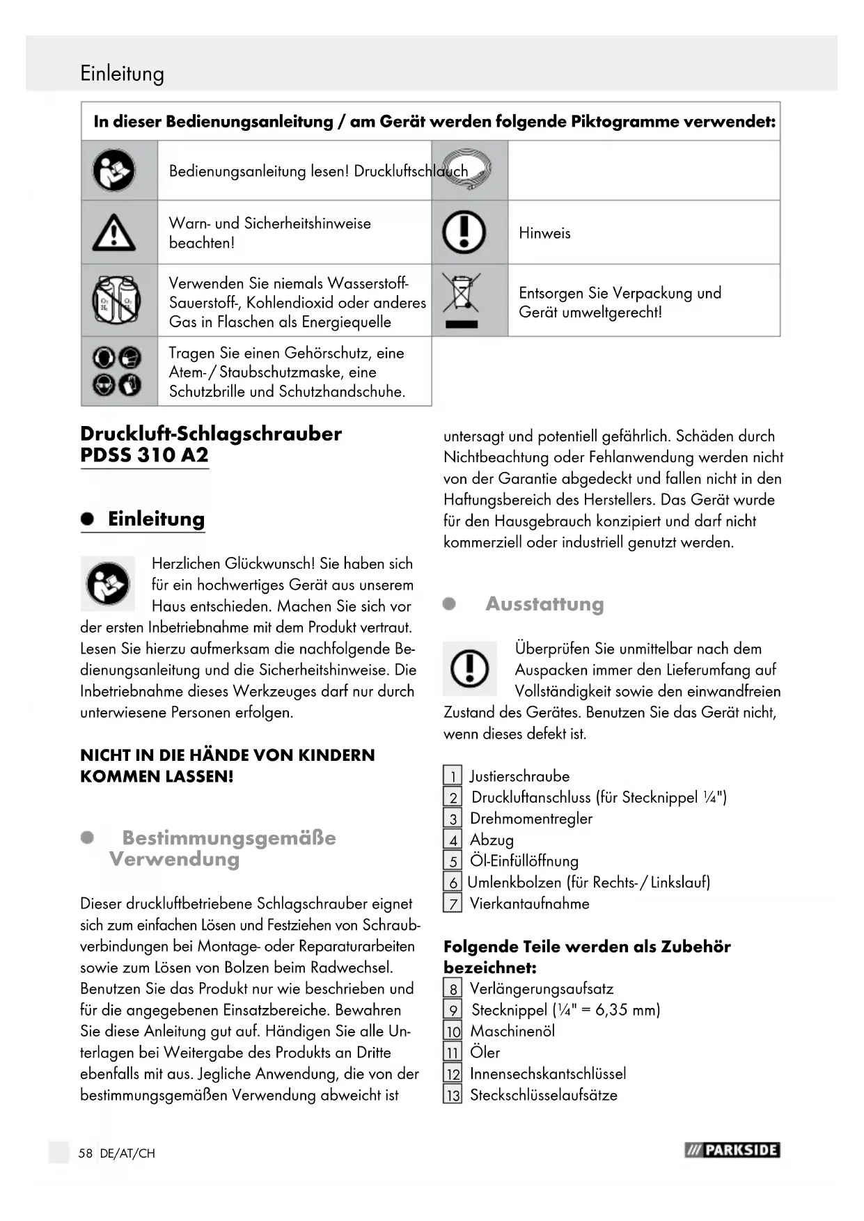 St. Ingbert, 30.04.2016 i.o. Daniel Havener56 Inhaltsverzeichnis57 DE/AT/CH Einleitung ......................................................................................................................................... Seite 58 Bestimmungsgemäße Verwendung ....................................................................................................Seite 58 Ausstattung ..........................................................................................................................................Seite 58 Technische Daten ................................................................................................................................Seite 59 Sicherheitshinweise für Druckluftwerkzeuge ..................................................Seite 59 Gefährdungen durch herausgeschleuderte Teile .............................................................................. Seite 61 Gefährdungen durch Erfassen / Aufwickeln ...................................................................................... Seite 61 Gefährdungen im Betrieb ................................................................................................................... Seite 62 Gefährdungen durch wiederholte Bewegungen ..............................................................................Seite 62 Gefährdungen durch Zubehörteile ....................................................................................................Seite 62 Gefährdungen am Arbeitsplatz .........................................................................................................Seite 63 Gefährdungen durch Staub und Dämpfe ..........................................................................................Seite 63 Gefährdungen durch Lärm .................................................................................................................Seite 63 Gefährdungen durch Schwingungen.................................................................................................Seite 64 Zusätzliche Sicherheitsan weisungen für pneumatische Maschinen .................................................Seite 64 Inbetriebnahme ......................................................................................................................... Seite 64 Steckschlüsselaufsätze oder Bit einsetzen .........................................................................................Seite 64 Anschlüsse vornehmen ........................................................................................................................Seite 65 Druckluft einstellen ..............................................................................................................................Seite 65 Drehmoment einstellen ........................................................................................................................Seite 65 In Betrieb nehmen ...............................................................................................................................Seite 65 Drehrichtung ändern ...........................................................................................................................Seite 66 Gerät richtig halten .............................................................................................................................Seite 66 Nach der Inbetriebnahme ................................................................................................Seite 66 Wartung ...........................................................................................................................................Seite 66 Reinigung und Pflege ............................................................................................................Seite 67 Fehlerbehebung ........................................................................................................................Seite 67 Hinweise zu Garantie und Serviceabwicklung ..............................................Seite 68 Garantiebedingungen ........................................................................................................................Seite 68 Garantieumfang .................................................................................................................................. Seite 68 Abwicklung im Garantiefall ................................................................................................................Seite 68 Umwelthinweise und Entsorgungsangaben ..................................................... Seite 69 EG-Konformitätserklärung ............................................................................................... Seite 69 Inhaltsverzeichnis58 DE/AT/CH Druckluft-Schlagschrauber PDSS 310 A2 Einleitung Herzlichen Glückwunsch! Sie haben sich für ein hochwertiges Gerät aus unserem Haus entschieden. Machen Sie sich vor der ersten Inbetriebnahme mit dem Produkt vertraut. Lesen Sie hierzu aufmerksam die nachfolgende Be- dienungsanleitung und die Sicherheitshinweise. Die Inbetriebnahme dieses Werkzeuges darf nur durch unterwiesene Personen erfolgen. NICHT IN DIE HÄNDE VON KINDERN KOMMEN LASSEN! Bestimmungsgemäße Verwendung Dieser druckluftbetriebene Schlagschrauber eignet sich zum einfachen Lösen und Festziehen von Schraub- verbindungen bei Montage- oder Reparaturarbeiten sowie zum Lösen von Bolzen beim Radwechsel. Benutzen Sie das Produkt nur wie beschrieben und für die angegebenen Einsatzbereiche. Bewahren Sie diese Anleitung gut auf. Händigen Sie alle Un- terlagen bei Weitergabe des Produkts an Dritte ebenfalls mit aus. Jegliche Anwendung, die von der bestimmungsgemäßen Verwendung abweicht ist untersagt und potentiell gefährlich. Schäden durch Nichtbeachtung oder Fehlanwendung werden nicht von der Garantie abgedeckt und fallen nicht in den Haftungsbereich des Herstellers. Das Gerät wurde für den Hausgebrauch konzipiert und darf nicht kommerziell oder ind