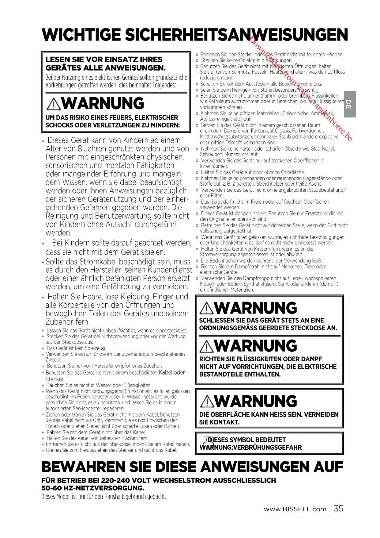 FÜR BETRIEB BEI 220-240 VOLT WECHSELSTROM AUSSCHLIESSLICH 50-60HZ-NETZVERSORGUNG. Dieses Modell ist nur für den Haushaltsgebrauch gedacht. Downloaded from www.vandenborre.beDE www.BISSELL.com