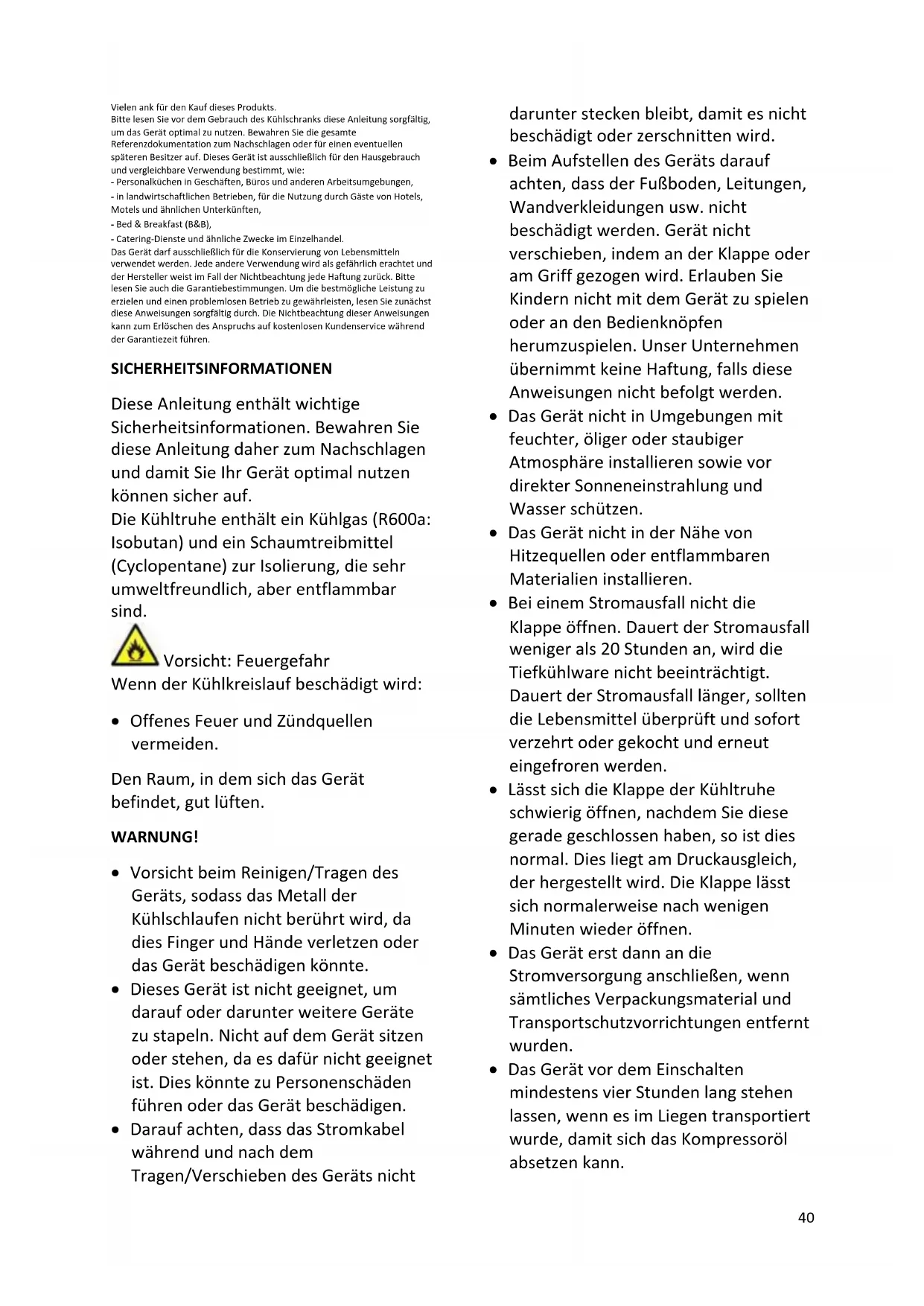 - Keine brennbaren und hoch flüchtigen Substanzen wie Äther, Benzin, Flüssiggas, Propan, Sprühdosen, Klebstoffe, reinen Alkohol usw. in der Kühltruhe aufbewahren - Explosionsgefahr!