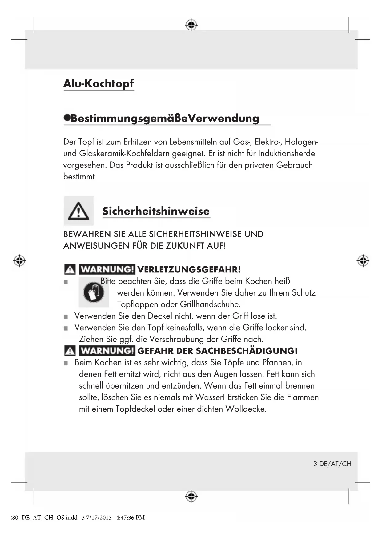 IAN 93280 Alu-Kochtopf Bedienungs- und Sicherheitshinweise Faitout en aluminium Instructions d‘utilisation et consignes de sécurité Aluminium kookpan Bedienings- en veiligheidsinstructies Pentola in alluminio Indicazioni per l’uso e per la sicurezza Alu-Kochtopf 93280_DE_AT_CH_OS.indd 1 7/17/2013 4:47:36 PMDE / AT / CH Bedienungs- und Sicherheitshinweise Seite 3 FR / CH Instructions d‘utilisation et consignes de sécurité Page 6 IT / CH Indicazioni per l’uso e per la sicurezza Pagina 9 NL Bedienings- en veiligheidsinstructies Pagina 12 93280_DE_AT_CH_OS.indd 2 7/17/2013 4:47:36 PM3 DE/AT/CH Alu-Kochtopf Bestimmungsgemäße Verwendung Der Topf ist zum Erhitzen von Lebensmitteln auf Gas-, Elektro-, Halogen- und Glaskeramik-Kochfeldern geeignet. Er ist nicht für Induktionsherde vorgesehen. Das Produkt ist ausschließlich für den privaten Gebrauch bestimmt. Sicherheitshinweise