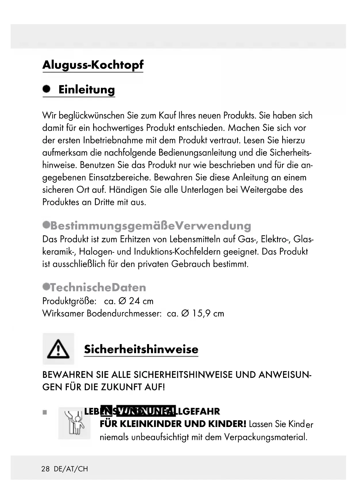 niemals unbeaufsichtigt mit dem Verpackungsmaterial.29 DE/AT/CH Es besteht Erstickungsgefahr durch Verpackungsmaterial. Kinder unterschätzen häufig die Gefahren. Halten Sie Kinder stets vom Verpackungsmaterial fern. VERLETZUNGSGEFAHR! Bitte beachten Sie, dass die Griffe beim Kochen heiß werden können. Verwenden Sie daher zu Ihrem Schutz Topflappen oder Grillhandschuhe. Verwenden Sie den Deckel nicht, wenn der Griff lose ist. Verwenden Sie das Produkt keinesfalls, wenn die Griffe locker sind. Ziehen Sie ggf. die Verschraubung der Griffe nach. GEFAHR DER SACHBESCHÄDIGUNG! Beim Kochen ist es sehr wichtig, dass Sie das Produkt, in dem Fett erhitzt wird, nicht aus den Augen lassen. Fett kann sich schnell über- hitzen und entzünden. Wenn das Fett einmal brennen sollte, löschen Sie es niemals mit Wasser! Ersticken Sie die Flammen mit einem Topfdeckel oder einer dichten Wolldecke. Um die Antihaftbeschichtung nicht zu beschädigen, verwenden Sie nur Küchenhelfer aus hitzebeständigem Kunststoff oder Holz. Schneiden Sie das Gargut nicht direkt in dem Produkt. Legen Sie kein tropfnasses Fleisch in heißes Fett. Durch das auf eine glühende Herdplatte spritzende Fett kann leicht ein Brand entstehen. Wählen Sie die dem Durchmesser des Produktbodens entsprech ende Kochplatte aus, um einen Hitzeverlust zu vermeiden. Der Durchmesser dieses Produkts ist ca. Ø 15,9 cm. Das Produkt ist zum Warmhalten von Speisen im Backofen geeignet (max. 160 °C für 1 Stunde). Reinigen Sie das Produkt nach dem Gebrauch. Wir empfehlen die Reinigung von Hand mit heißem Wasser und Spülmittel, weil die Reinigung in der Spülmaschine zu Verfärbungen der Aluminium-Teile führen kann. ACHTUNG! Der Glasdeckel ist zerbrechlich / nicht stoßfest!30 DE/AT/CH Beim Spülen von Hand reinigen Sie das Produkt mit heißem Wasser und handelsüblichem Spülmittel. Vermeiden Sie dabei den Gebrauch von scharfen und spitzen Gegenständen, um das Material nicht zu beschädigen. Benutzen Sie zur Reinigung keine scharfen Scheuermittel. ACHTUNG! VERKRATZUNGSGEFAHR! Vermeiden Sie das Hin- und Herschieben des Produkts auf Glaskeramik-Kochfeldern! Bevor Sie mit dem Kochen beginnen, empfehlen wir Ihnen, die Oberfläche des Kochfelds und den Boden des Produkts mit einem sauberen, fusselfreien Tuch (zum Beispiel Mikrofaser) abzuwischen. Dadurch können Sie Kratzer vorbeugen. Das heiße Produkt niemals unter laufendes kaltes Wasser halten. Die Unterseite des Produkts könnte dadurch beschädigt werden oder vom Produkt abfallen. LEBENSMITTELECHT! Geschmacks- und Geruchs- eigenschaften werden durch dieses Produkt nicht beeinträchtigt. Das Produkt ist für die Spülmaschine geeignet. Hinweis für Induktionskochfelder Hinweis: Unter bestimmten Umständen kann ein Geräusch auf- treten, dass auf die elektromagnetischen Eigenschaften der Heiz- quelle und des Produkts zurückzuführen ist. Dies ist normal und deutet nicht auf einen Defekt Ihres Induktions- kochfeldes oder des Produkts hin. Das Produkt ist mittig auf dem Induktionskochfeld anzuordnen.31 DE/AT/CH ACHTUNG! Hohe Aufheizgeschwindigkeit! Das Produkt beim Vorheizen nicht überhitzen. Im Falle einer Überhitzung des Produkts muss der Raum gründlich gelüftet werden. Gebrauch Bitte entfernen Sie vor dem ersten Gebrauch eventuelle Aufkleber von dem Produkt und spülen Sie es mit heißem Wasser aus. Kochen Sie das Produkt vor dem ersten Gebrauch 2 bis 3 mal mit Wasser aus, um eventuelle Produktionsrückstände vollständig zu entfernen. Fetten Sie das Produkt leicht ein. Überhitzen Sie das Produkt nicht, wenn es leer oder mit Bratgut ge- füllt ist, da sonst der Antihafteffekt nachlässt bzw. die Beschichtung beschädigt wird. Erhitzen Sie das Gargut bei hoher / mittlerer Hitze und lassen Sie es dann auf kleiner Stufe fertig garen. Entsorgung Die Verpackung besteht aus umweltfreundlichen Materialien, die Sie über die örtlichen Recyclingstellen entsorgen können. Möglichkeiten zur Entsorgung des ausgedienten Produkts erfahren Sie bei Ihrer Gemeinde- oder Stadtverwaltung. Garantie Das Produkt wurde nach strengen Qualitätsrichtlinien sorgfältig produziert und vor Anlieferung gewissenhaft geprüft. Im Falle von Mängeln dieses32 DE/AT/CH Produkts stehen Ihnen gegen den Verkäufer des Produkts gesetzliche Rechte zu. Diese gesetzlichen Rechte werden durch unsere im Folgenden dargestellte Garantie nicht eingeschränkt. Sie erhalten auf dieses Produkt 3 Jahre Garantie ab Kaufdatum. Die Garantiefrist beginnt mit dem Kaufdatum. Bitte bewahren Sie den Ori- ginal-Kassenbon gut auf. Diese Unterlage wird als Nachweis für den Kauf benötigt. Tritt innerhalb von 3 Jahren ab dem Kaufdatum dieses Produkts ein Material- oder Fabrikationsfehler auf, wird das Produkt von uns – nach unserer Wahl – für Sie kostenlos repariert oder ersetzt. Diese Garantie verfällt, wenn das Produkt beschädigt, nicht sachgemäß benutzt oder gewartet wurde. Die Garantieleistung gilt für Material- oder Fabrikationsfehler. Diese Garantie erstreckt sich nicht auf Produktteile, die normaler Abnutzung ausgesetzt sind (z. B. Batterien) und daher als Verschleißteile angesehen werden können oder Beschädigungen an zerbrechlichen Teilen, z. B. Schalter, Akkus oder die aus Glas gefertigt sind.OWIM GmbH & Co. KG Stiftsbergstraße 1 DE-74167 Neckarsulm GERMANY Model-No.: HG04351 Version: 11 / 2018 Last Information Update · Tilstand af information · Version des informations · Stand van de informatie · Stand der Informationen: 10 / 2018 · Ident.-No.: HG04351102018-6 IAN 309677