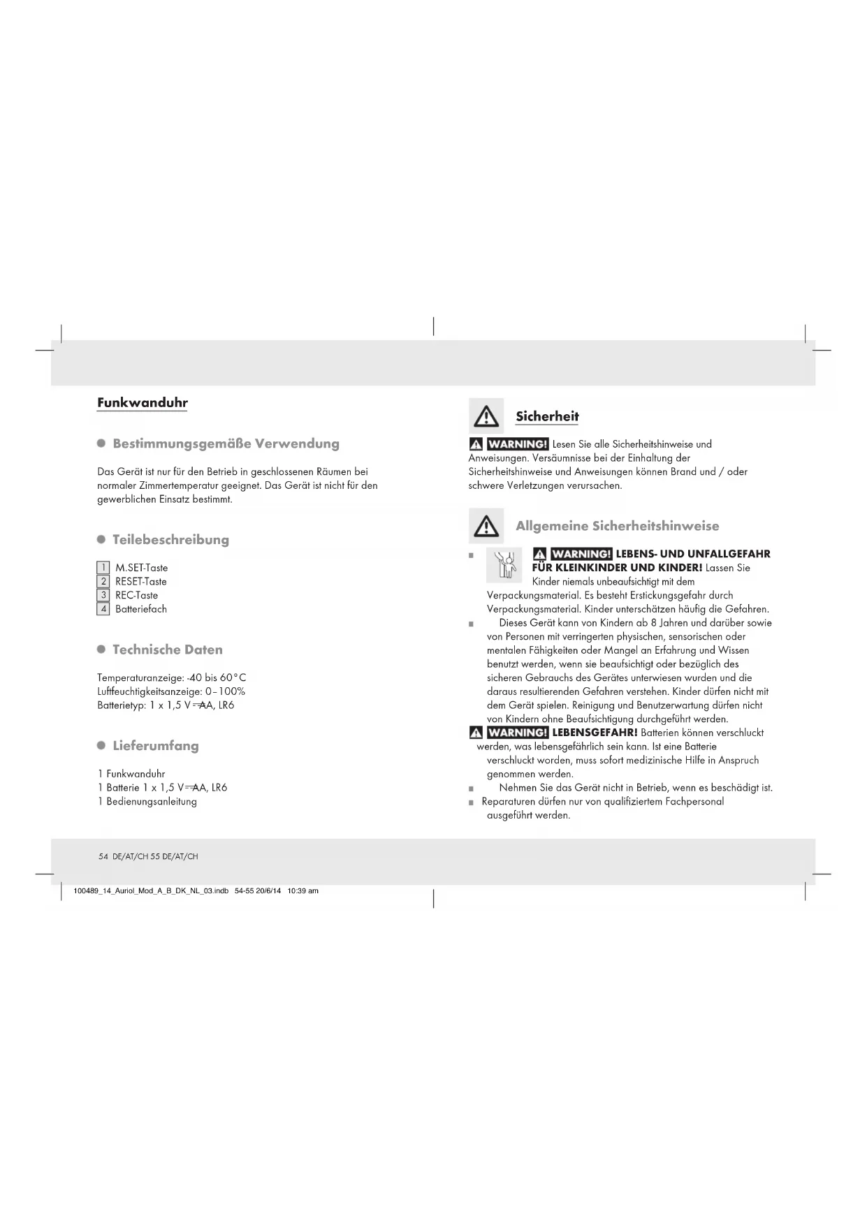FÜR KLEINKINDER UND KINDER! Lassen Sie Kinder niemals unbeaufsichtigt mit dem Verpackungsmaterial. Es besteht Erstickungsgefahr durch Verpackungsmaterial. Kinder unterschätzen häufig die Gefahren. Dieses Gerät kann von Kindern ab 8 Jahren und darüber sowie von Personen mit verringerten physischen, sensorischen oder mentalen Fähigkeiten oder Mangel an Erfahrung und Wissen benutzt werden, wenn sie beaufsichtigt oder bezüglich des sicheren Gebrauchs des Gerätes unterwiesen wurden und die daraus resultierenden Gefahren verstehen. Kinder dürfen nicht mit dem Gerät spielen. Reinigung und Benutzerwartung dürfen nicht von Kindern ohne Beaufsichtigung durchgeführt werden. LEBENSGEFAHR! Batterien können verschluckt werden, was lebensgefährlich sein kann. Ist eine Batterie verschluckt worden, muss sofort medizinische Hilfe in Anspruch genommen werden. Nehmen Sie das Gerät nicht in Betrieb, wenn es beschädigt ist. Reparaturen dürfen nur von qualifiziertem Fachpersonal ausgeführt werden. 100489_14_Auriol_Mod_A_B_DK_NL_03.indb 54-55 20/6/14 10:39 am56 DE/AT/CH 57 DE/AT/CH Sicherheitshinweise zu Batterien Entfernen Sie die Batterie, wenn sie längere Zeit nicht verwendet worden ist, aus dem Gerät. VORSICHT! EXPLOSIONSGEFAHR! Laden Sie Batterien niemals wieder auf! Achten Sie beim Einlegen auf die richtige Polarität! Diese wird im Batteriefach angezeigt. Reinigen Sie Batterie- und Gerätekontakt vor dem Einlegen falls erforderlich. Entfernen Sie eine erschöpfte Batterie umgehend aus dem Gerät. Es besteht erhöhte Auslaufgefahr! Bei Nichtbeachtung der vorher genannten Hinweise kann die Batterie über ihre Endspannung hinaus entladen werden. Es besteht dann die Gefahr des Auslaufens. Falls die Batterie in Ihrem Gerät ausgelaufen sein sollte, entnehmen Sie diese sofort, um Schäden am Gerät vorzubeugen! Batterien gehören nicht in den Hausmüll! Jeder Verbraucher ist gesetzlich verpflichtet, Batterien ordnungsgemäß zu entsorgen! Halten Sie Batterien von Kindern fern, werfen Sie Batterien nicht ins Feuer, schließen Sie Batterien nicht kurz und nehmen Sie sie nicht auseinander. Vermeiden Sie den Kontakt mit Haut, Augen und Schleimhäuten. Bei Kontakt mit Batteriesäure spülen Sie die betroffene Stelle mit reichlich Wasser ab und / oder suchen Sie einen Arzt auf!