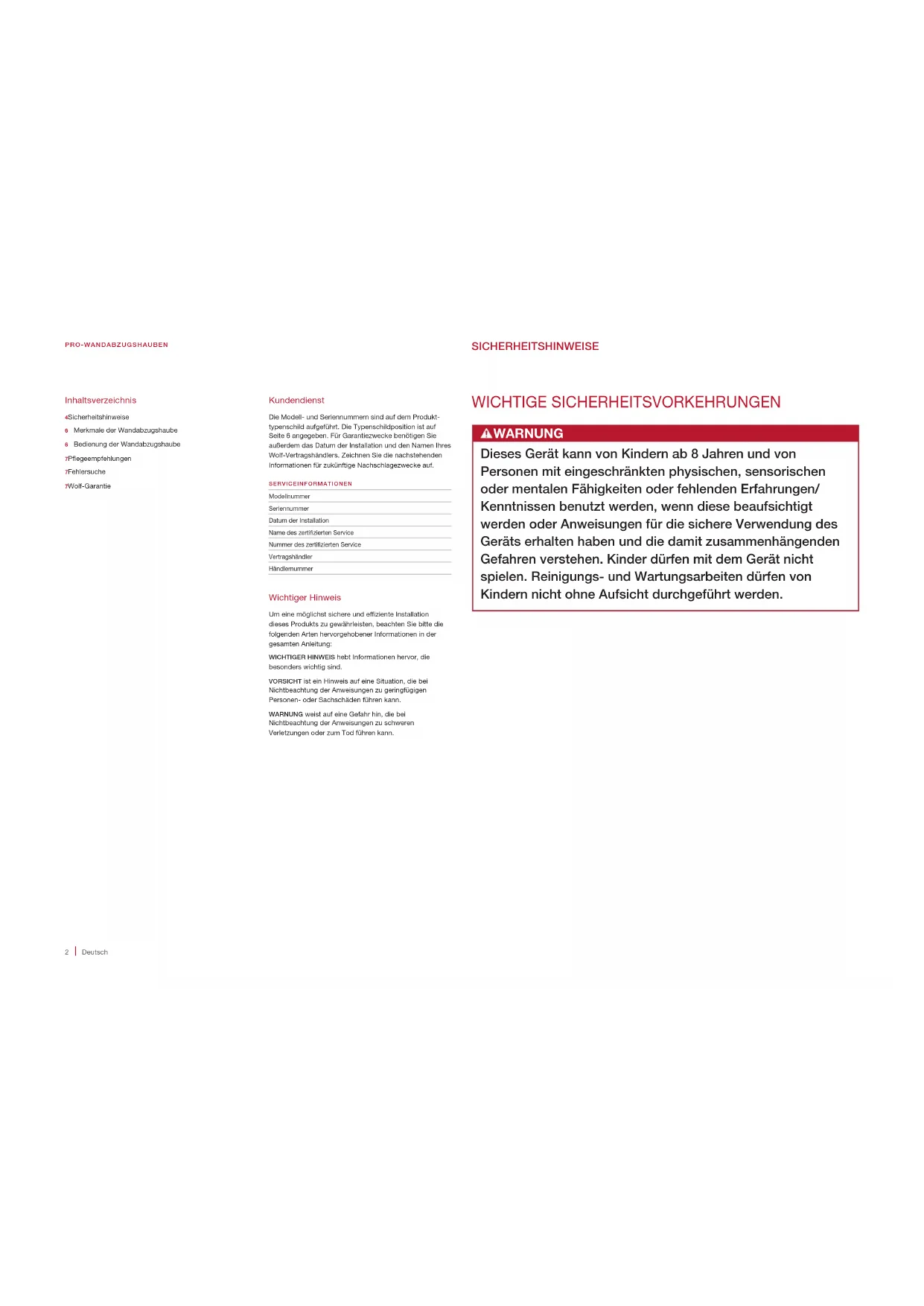 Per cinque anni dalla data di installazione originale, Wolf Appliance ripara o sostituisce le seguenti parti che rivelino difetti di materiale o manodopera: vassoi con griglia in acciaio, valvole del gas, vaschette, schede elettroniche di controllo e elementi riscaldanti elettrici. Se il proprietario utilizza un centro di assistenza certicato Wolf, il centro assistenza riparerà o sostituirà le summenzionate parti ed al proprietario spetteranno tutti gli altri costi, inclusa la manodopera. Se il proprietario si rivolge ad un centro assistenza non certicato, il proprietario dovrà contattare Wolf Appliance, Inc. (utilizzando le informazione che trova in basso) per ricevere le parti riparate o sostituite. Wolf Appliance non rimborserà il proprietario per parti ordinate presso un centro assistenza non certicato o altri. Per maggiori informazioni sulla garanzia dei prodotti Wolf, contattate il vostro rivenditore autorizzato Wolf. Le garanzie devono osservare le leggi di tutti i paesi, stati, città, località. *L’acciaio inossidabile (porte, pannelli, maniglie, telaio del prodotto e le superci interne) è coperto da una garanzia limitata di 60 giorni su parti e manodopera per difetti cosmetici. Sub-Zero, Sub-Zero & Design, Sub-Zero & Snowake Design, Dual Refrigeration, The Living Kitchen, Great American Kitchens The Fine Art of Kitchen Design, Wolf, Wolf & Design, Wolf Gourmet, W & Design, red colored knobs, Cove e Cove & Design, sono marchi registrati e marchi di servizio di Sub-Zero Group, Inc. e delle sue sussidiarie. Tutti gli altri marchi registrati sono di proprietà dei rispettivi titolari negli Stati Uniti e in altri paesi.2 Deutsch WICHTIGE SICHERHEITSVORKEHRUNGEN WARNUNG Dieses Gerät kann von Kindern ab 8 Jahren und von Personen mit eingeschränkten physischen, sensorischen oder mentalen Fähigkeiten oder fehlenden Erfahrungen/ Kenntnissen benutzt werden, wenn diese beaufsichtigt werden oder Anweisungen für die sichere Verwendung des Geräts erhalten haben und die damit zusammenhängenden Gefahren verstehen. Kinder dürfen mit dem Gerät nicht spielen. Reinigungs- und Wartungsarbeiten dürfen von Kindern nicht ohne Aufsicht durchgeführt werden. Inhaltsverzeichnis 4 Sicherheitshinweise6 Merkmale der Wandabzugshaube6 Bedienung der Wandabzugshaube7 Pegeempfehlungen7 Fehlersuche7 Wolf-GarantiePRO-WANDABZUGSHAUBEN Kundendienst Die Modell- und Seriennummern sind auf dem Produkt-typenschild aufgeführt. Die Typenschildposition ist auf Seite 6 angegeben. Für Garantiezwecke benötigen Sie außerdem das Datum der Installation und den Namen Ihres Wolf-Vertragshändlers. Zeichnen Sie die nachstehenden Informationen für zukünftige Nachschlagezwecke auf.SERVICEINFORMATIONENModellnummerSeriennummerDatum der InstallationName des zertizierten ServiceNummer des zertizierten ServiceVertragshändlerHändlernummer Wichtiger Hinweis Um eine möglichst sichere und efziente Installation dieses Produkts zu gewährleisten, beachten Sie bitte die folgenden Arten hervorgehobener Informationen in der gesamten Anleitung:WICHTIGER HINWEIS hebt Informationen hervor, die besonders wichtig sind. VORSICHT ist ein Hinweis auf eine Situation, die bei Nichtbeachtung der Anweisungen zu geringfügigen Personen- oder Sachschäden führen kann.WARNUNG weist auf eine Gefahr hin, die bei Nichtbeachtung der Anweisungen zu schweren Verletzungen oder zum Tod führen kann. SICHERHEITSHINWEISEwolfappliance.com