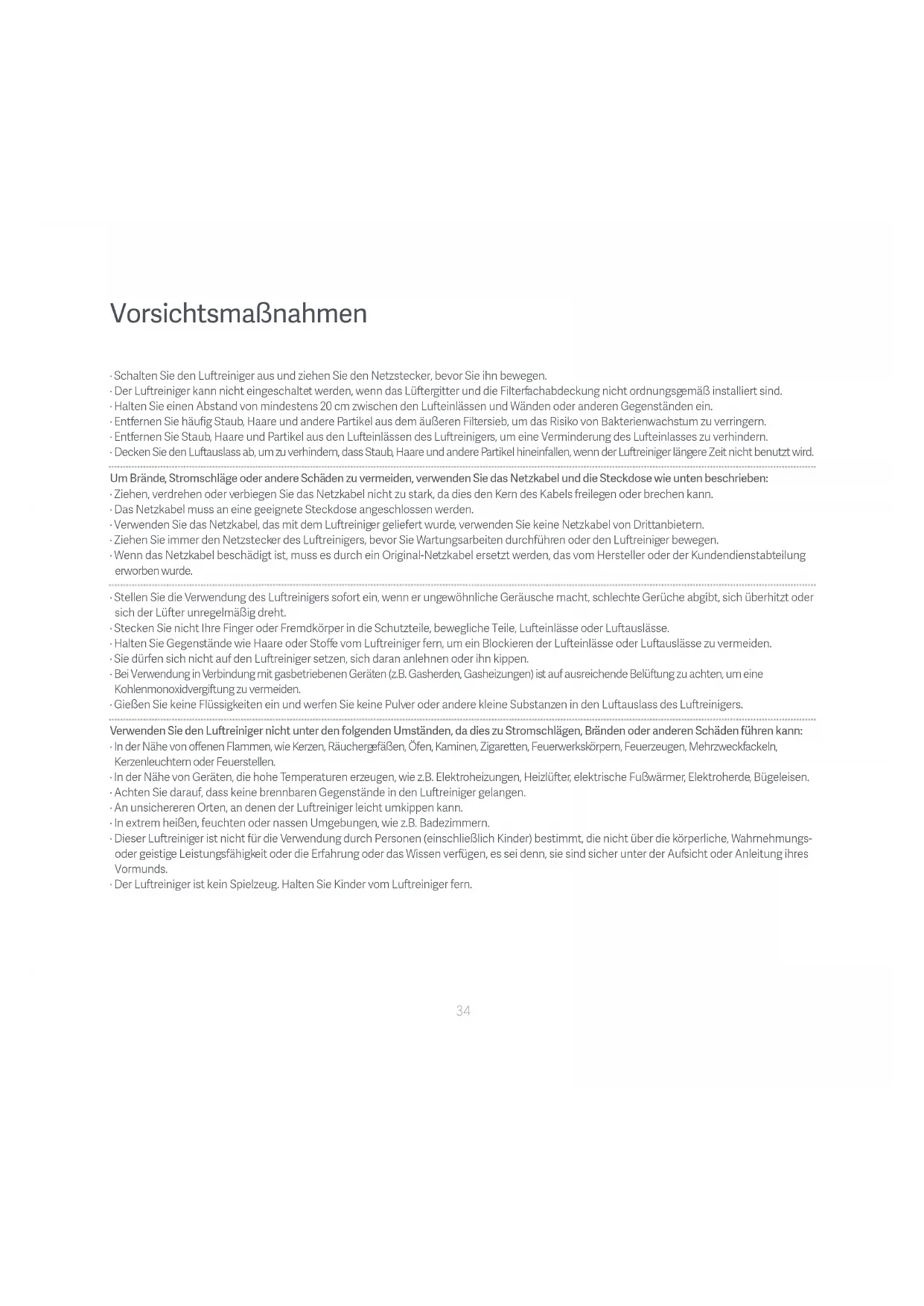- Dieser Luftreiniger ist nicht für die Verwendung durch Personen (einschließlich Kinder) bestimmt, die nicht über die körperliche, Wahrnehmungs- oder geistige Leistungsfähigkeit oder die Erfahrung oder das Wissen verfügen, es sei denn, sie sind sicher unter der Aufsicht oder Anleitung ihres Vormunds.