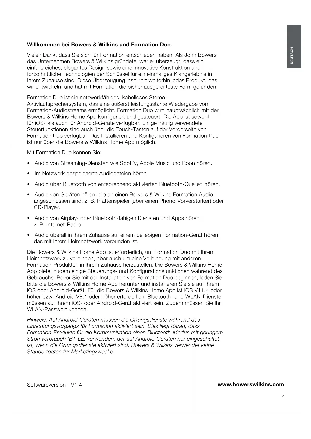 - Audio überall in Ihrem Zuhause auf einem beliebigen Formation-Gerät hören, das mit Ihrem Heimnetzwerk verbunden ist. Die Bowers & Wilkins Home App ist erforderlich, um Formation Duo mit Ihrem Heimnetzwerk zu verbinden, aber auch um eine Verbindung mit anderen Formation-Produkten in Ihrem Zuhause herzustellen. Die Bowers & Wilkins Home App bietet zudem einige Steuerungs- und Kongurationsfunktionen während des Gebrauchs. Bevor Sie mit der Installation von Formation Duo beginnen, laden Sie bitte die Bowers & Wilkins Home App herunter und installieren Sie sie auf Ihrem iOS oder Android-Gerät. Für die Bowers & Wilkins Home App ist iOS V11.4 oder höher bzw. Android V8.1 oder höher erforderlich. Bluetooth- und WLAN-Dienste müssen auf Ihrem iOS- oder Android-Gerät aktiviert sein. Zudem müssen Sie Ihr WLAN-Passwort kennen. Hinweis: Auf Android-Geräten müssen die Ortungsdienste während des Einrichtungsvorgangs für Formation aktiviert sein. Dies liegt daran, dass Formation-Produkte für die Kommunikation einen Bluetooth-Modus mit geringem Stromverbrauch (BT-LE) verwenden, der auf Android-Geräten nur eingeschaltet ist, wenn die Ortungsdienste aktiviert sind. Bowers & Wilkins verwendet keine Standortdaten für Marketingzwecke. Softwareversion - V1.4 DEUTSCH Inhalt DEUTSCH 2