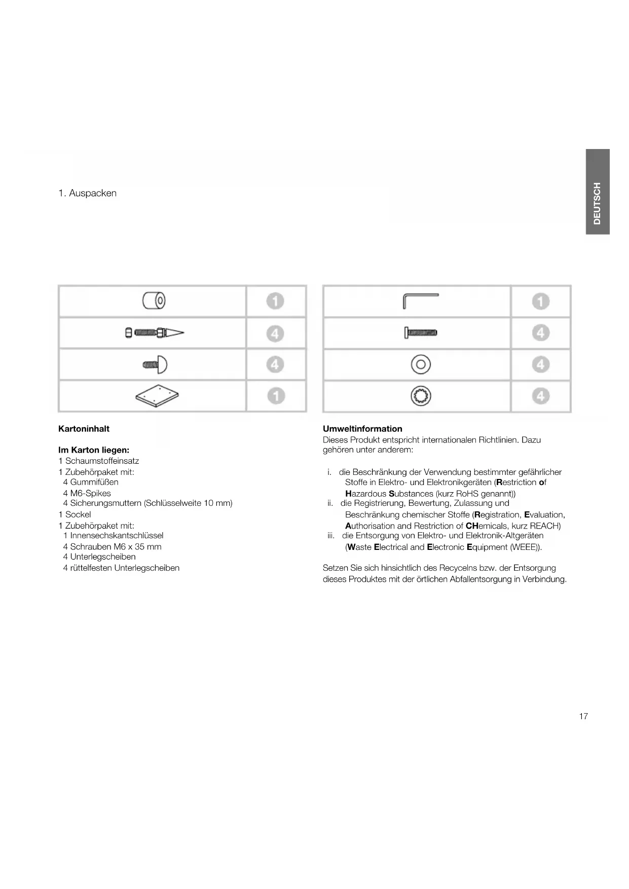 Kartoninhalt Im Karton liegen: 1 Schaumstoffeinsatz 1 Zubehörpaket mit: 4 Gummifüßen 4 M6-Spikes 4 Sicherungsmuttern (Schlüsselweite 10 mm) 1 Sockel 1 Zubehörpaket mit: 1 Innensechskantschlüssel 4 Schrauben M6 x 35 mm 4 Unterlegscheiben 4 rüttelfesten Unterlegscheiben Umweltinformation Dieses Produkt entspricht internationalen Richtlinien. Dazu gehören unter anderem:
