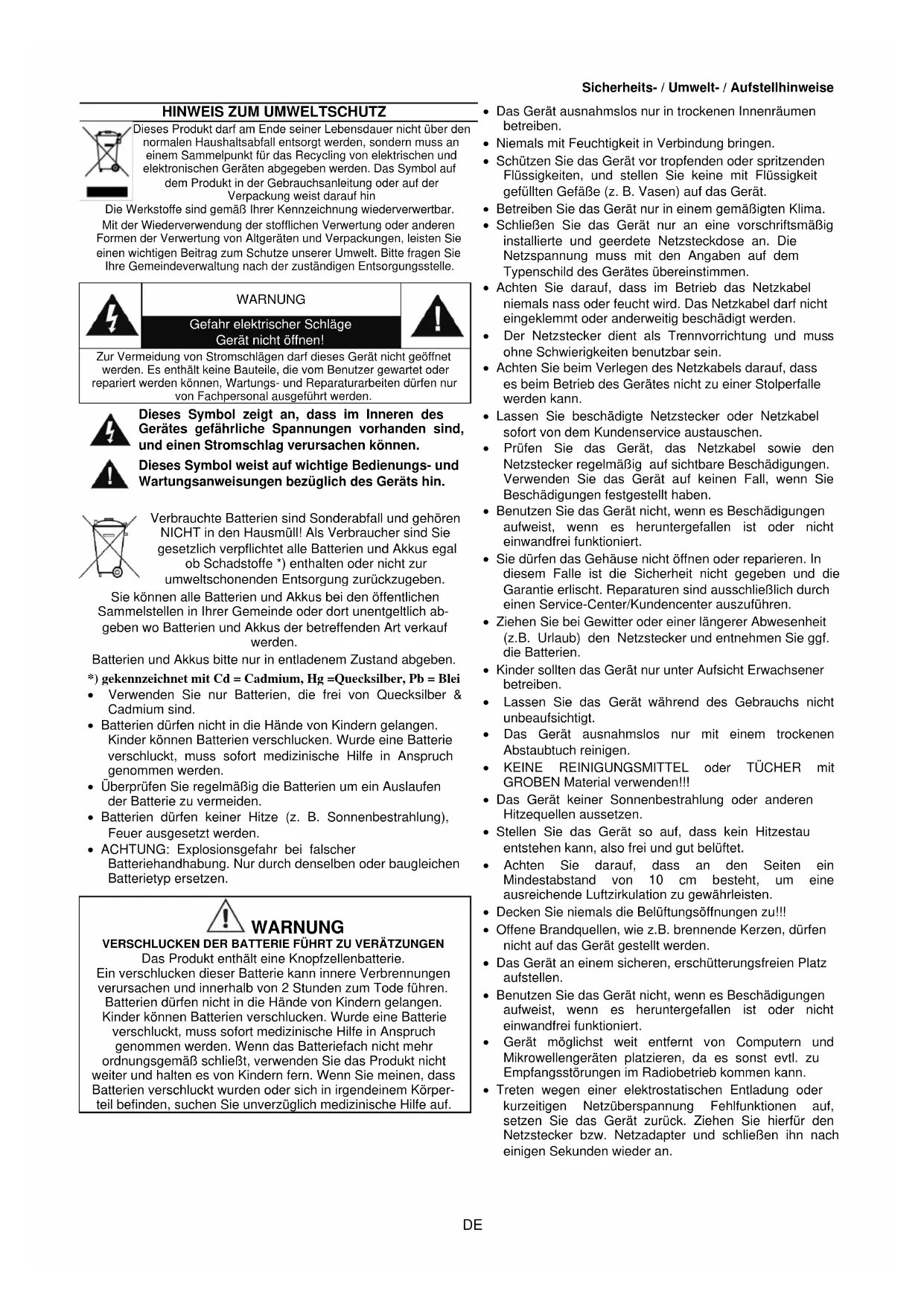 Sie können alle Batterien und Akkus bei den öffentlichen Sammelstellen in Ihrer Gemeinde oder dort unentgeltlich ab- geben wo Batterien und Akkus der betreffenden Art verkauf werden. Batterien und Akkus bitte nur in entladenem Zustand abgeben. *) gekennzeichnet mit Cd = Cadmium, Hg =Quecksilber, Pb = Blei
