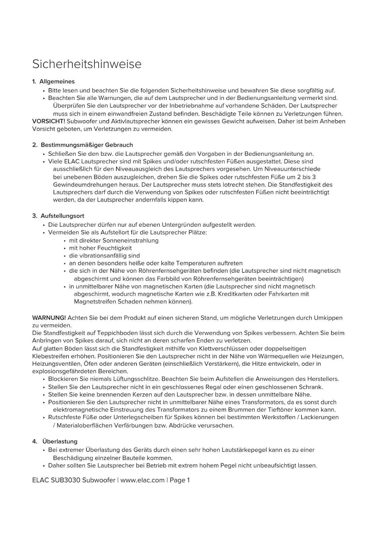- Schließen Sie diesen Subwoofer nur an die auf der Rückwand des Gehäuses angegebenen Spannungen an. Der Anschluss an andere Spannungen kann zu irreversiblen Schäden am Subwoofer führen und hat das Erlöschen der Gewährleistung zur Folge. Die Verwendung von Netzsteckeradaptern wird nicht empfohlen, da diese den Anschluss an andere als den auf der Rückseite dieses Subwoofers vermerkten Spannungen ermöglichen. ELAC SUB3030 Subwoofer | www.elac.com | Page 2Philosophie Vielen Dank, dass Sie sich für den Kauf dieses ELAC Produkts entschieden haben. Seit der Firmengründung im Jahre 1926 hat sich ELAC stetiges Streben nach Höchstleistung zum Prinzip gemacht. Ihre neuen ELAC Lautsprecher mit ihren qualitativ hochwertigen Bauteilen wurden für höchste Ansprüche konstruiert und bieten exquisite Klangqualität. Konzipiert wurden sie von einer Gruppe passionierter Entwickler mit dem Ziel, eine völlig neue Dimension der Klangwiedergabe in Ihr Zuhause zu bringen. Viel Freude mit Ihren ELAC Lautsprechern! Achten Sie darauf, die Lautsprecher und andere Bauteile nicht zu beschädigen: