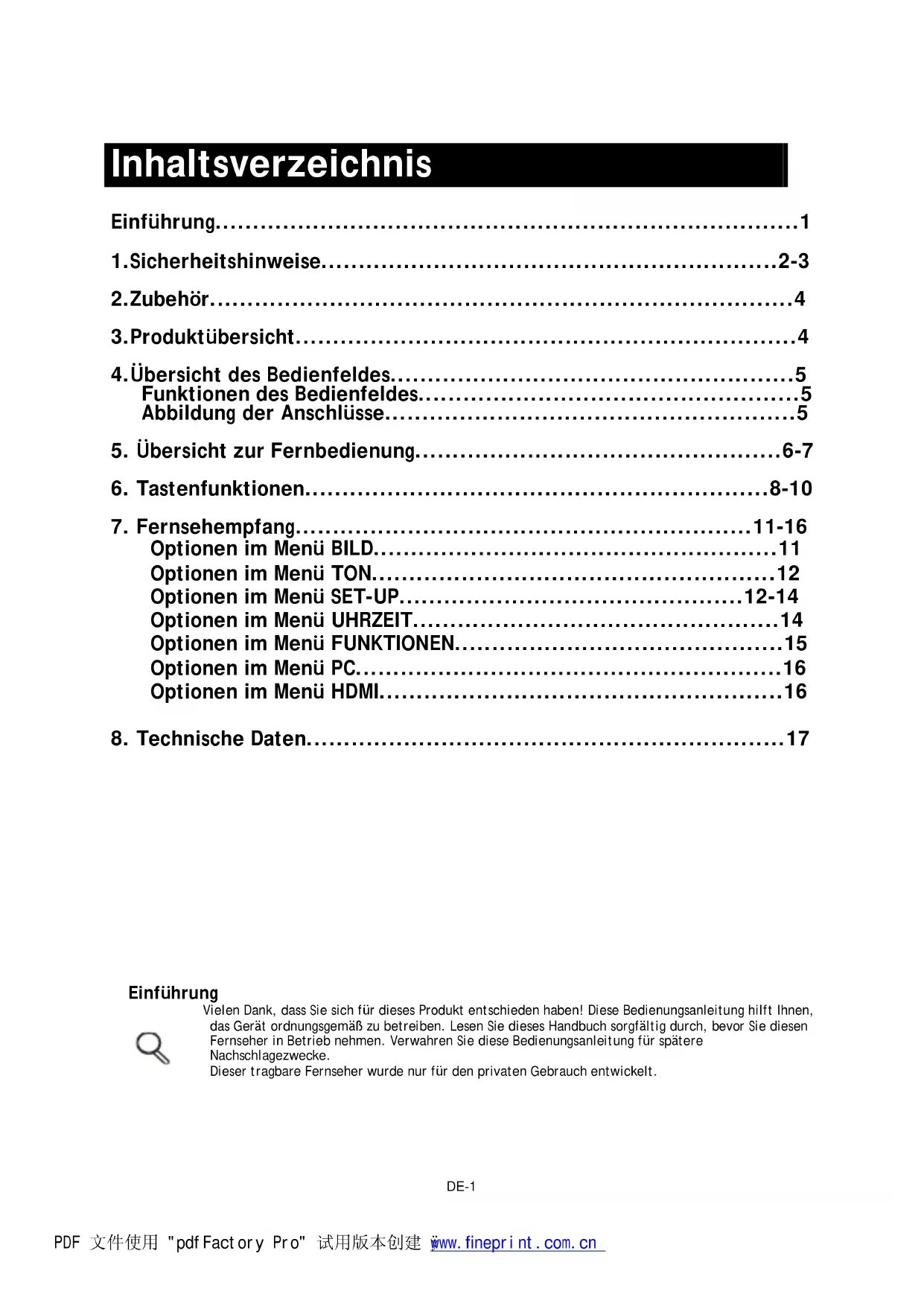 PDF 文件使用 "pdfFactory Pro" 试用版本创建 ÿ www.fineprint.com.cnDE-9 5 Lautstärkeregler Drücken Sie die Taste V+, um den Ton lauter zu regeln. Drücken Sie die Taste V-, um den Ton leiser zu regeln.