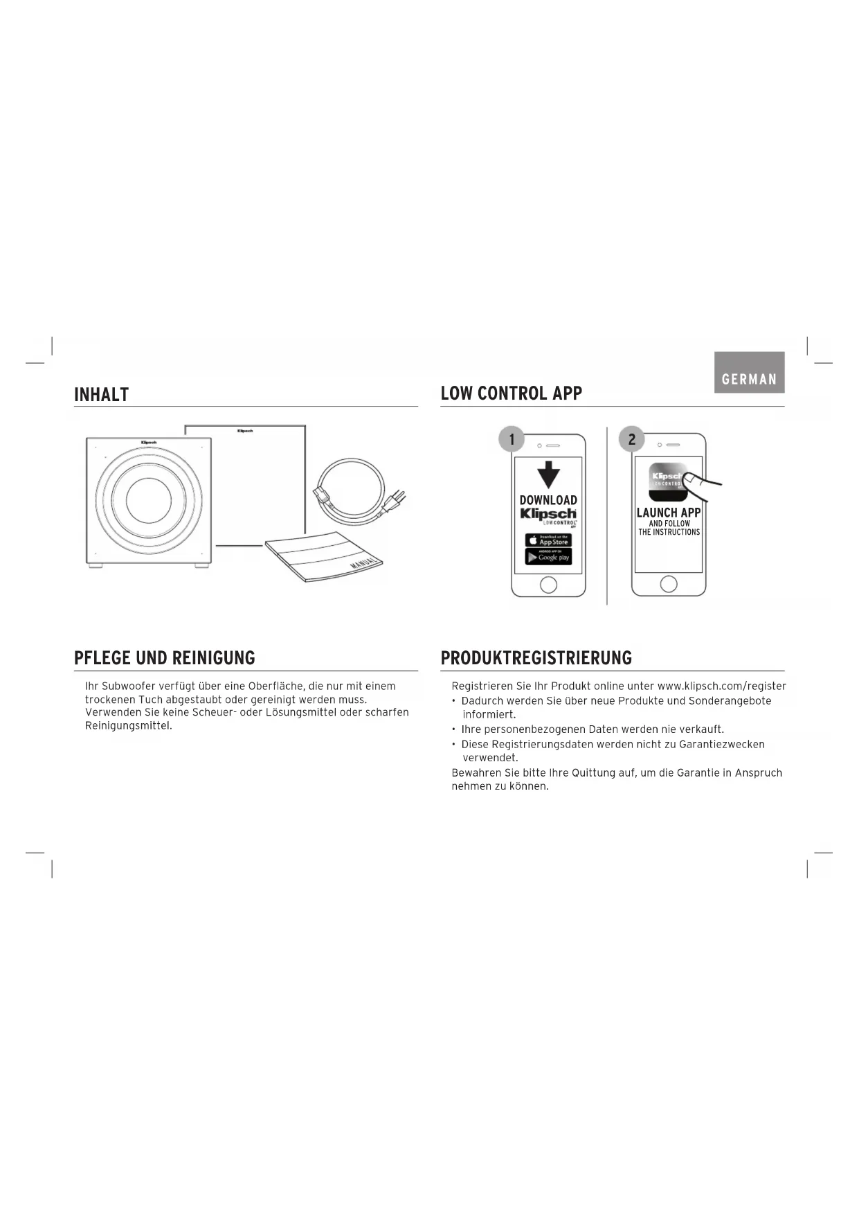 Registrieren Sie Ihr Produkt online unter www.klipsch.com/register• Dadurch werden Sie über neue Produkte und Sonderangebote informiert.• Ihre personenbezogenen Daten werden nie verkauft.• Diese Registrierungsdaten werden nicht zu Garantiezwecken verwendet. Bewahren Sie bitte Ihre Quittung auf, um die Garantie in Anspruch nehmen zu können. PRODUKTREGISTRIERUNG