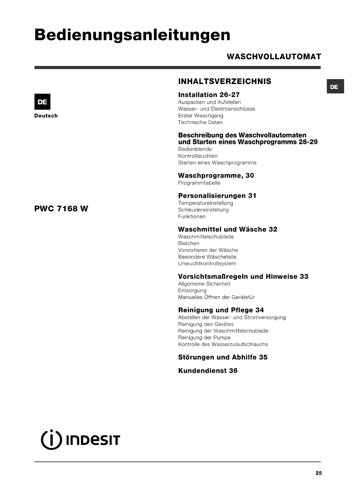 Deutsch INHALTSVERZEICHNIS Installation 26-27 Auspacken und Aufstellen Wasser- und Elektroanschlüsse Erster Waschgang Technische Daten Beschreibung des Waschvollautomaten und Starten eines Waschprogramms 28-29 Bedienblende Kontrollleuchten Starten eines Waschprogramms Waschprogramme, 30 Programmtabelle Personalisierungen 31 Temperatureinstellung Schleudereinstellung Funktionen Waschmittel und Wäsche 32 Waschmittelschublade Bleichen Vorsortieren der Wäsche Besondere Wäscheteile Unwuchtkontrollsystem Vorsichtsmaßregeln und Hinweise 33 Allgemeine Sicherheit Entsorgung Manuelles Öffnen der Gerätetür Reinigung und Pflege 34 Abstellen der Wasser- und Stromversorgung Reinigung des Gerätes Reinigung der Waschmittelschublade Reinigung der Pumpe Kontrolle des Wasserzulaufschlauchs Störungen und Abhilfe 35 Kundendienst 36