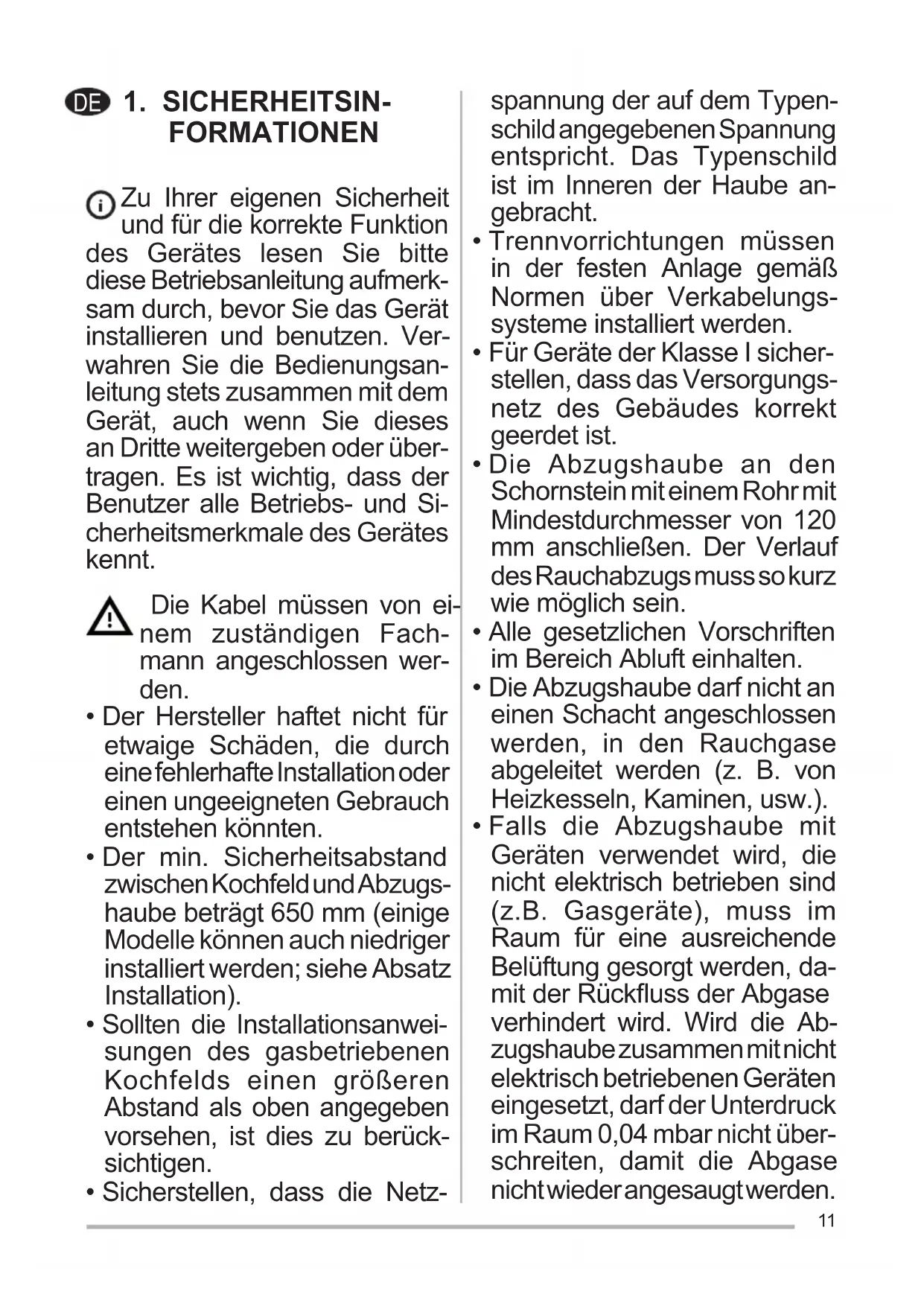 - Falls die Abzugshaube mit Geräten verwendet wird, die nicht elektrisch betrieben sind (z.B. Gasgeräte), muss im Raum für eine ausreichende Belüftung gesorgt werden, da- mit der Rückuss der Abgase verhindert wird. Wird die Ab- zugshaube zusammen mit nicht elektrisch betriebenen Geräten eingesetzt, darf der Unterdruck im Raum 0,04 mbar nicht über- schreiten, damit die Abgase nicht wieder angesaugt werden.