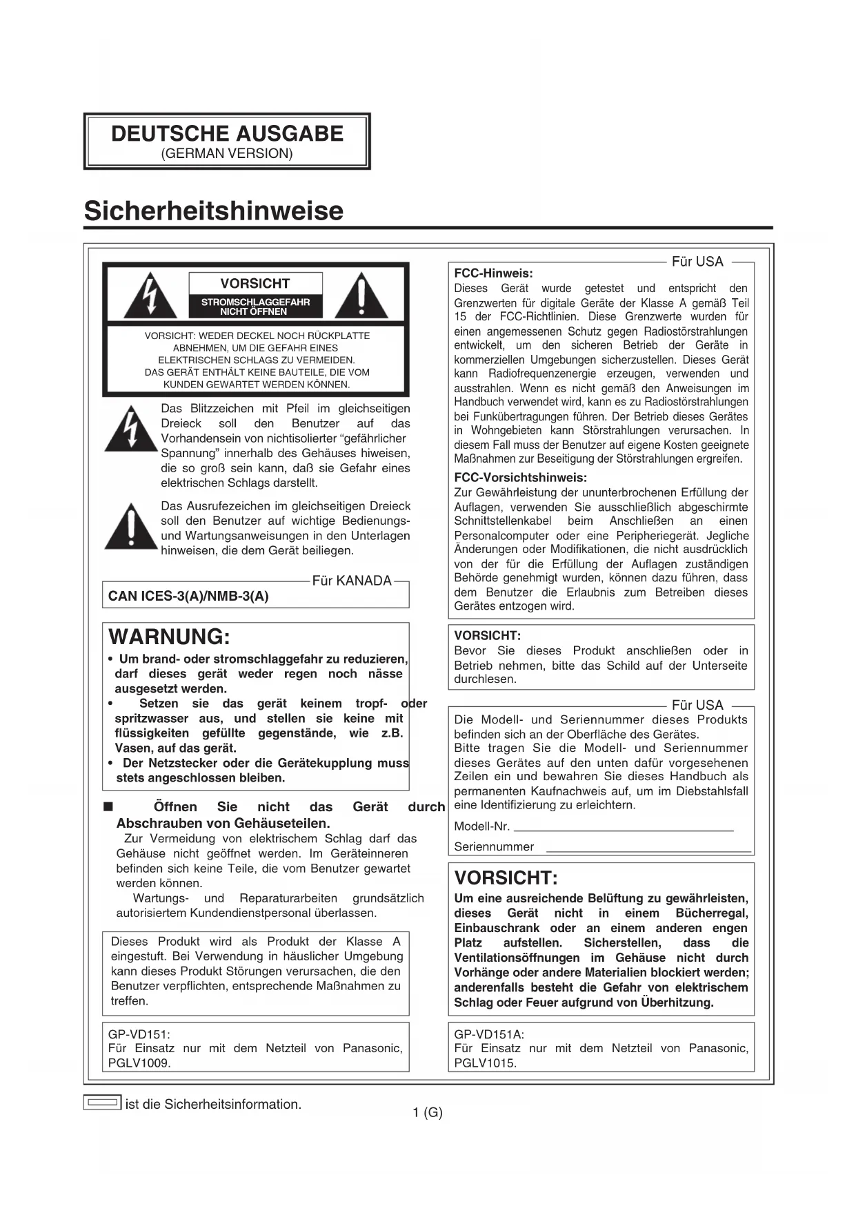 - Der Netzstecker oder die Gerätekupplung muss stets angeschlossen bleiben. VORSICHT: Um eine ausreichende Belüftung zu gewährleisten, dieses Gerät nicht in einem Bücherregal, Einbauschrank oder an einem anderen engen Platz aufstellen. Sicherstellen, dass die Ventilationsöffnungen im Gehäuse nicht durch Vorhänge oder andere Materialien blockiert werden; anderenfalls besteht die Gefahr von elektrischem Schlag oder Feuer aufgrund von Überhitzung. VORSICHT: Bevor Sie dieses Produkt anschließen oder in Betrieb nehmen, bitte das Schild auf der Unterseite durchlesen. Die Modell- und Seriennummer dieses Produkts befinden sich an der Oberfläche des Gerätes. Bitte tragen Sie die Modell- und Seriennummer dieses Gerätes auf den unten dafür vorgesehenen Zeilen ein und bewahren Sie dieses Handbuch als permanenten Kaufnachweis auf, um im Diebstahlsfall eine Identifizierung zu erleichtern. Modell-Nr. Seriennummer Für USA GP-VD151A: Für Einsatz nur mit dem Netzteil von Panasonic, PGLV1015. Öffnen Sie nicht das Gerät durch Abschrauben von Gehäuseteilen. Zur Vermeidung von elektrischem Schlag darf das Gehäuse nicht geöffnet werden. Im Geräteinneren befinden sich keine Teile, die vom Benutzer gewartet werden können. Wartungs- und Reparaturarbeiten grundsätzlich autorisiertem Kundendienstpersonal überlassen. Dieses Produkt wird als Produkt der Klasse A eingestuft. Bei Verwendung in häuslicher Umgebung kann dieses Produkt Störungen verursachen, die den Benutzer verpflichten, entsprechende Maßnahmen zu treffen. FCC-Hinweis: Dieses Gerät wurde getestet und entspricht den Grenzwerten für digitale Geräte der Klasse A gemäß Teil 15 der FCC-Richtlinien. Diese Grenzwerte wurden für einen angemessenen Schutz gegen Radiostörstrahlungen entwickelt, um den sicheren Betrieb der Geräte in kommerziellen Umgebungen sicherzustellen. Dieses Gerät kann Radiofrequenzenergie erzeugen, verwenden und ausstrahlen. Wenn es nicht gemäß den Anweisungen im Handbuch verwendet wird, kann es zu Radiostörstrahlungen bei Funkübertragungen führen. Der Betrieb dieses Gerätes in Wohngebieten kann Störstrahlungen verursachen. In diesem Fall muss der Benutzer auf eigene Kosten geeignete Maßnahmen zur Beseitigung der Störstrahlungen ergreifen. FCC-Vorsichtshinweis: Zur Gewährleistung der ununterbrochenen Erfüllung der Auflagen, verwenden Sie ausschließlich abgeschirmte Schnittstellenkabel beim Anschließen an einen Personalcomputer oder eine Peripheriegerät. Jegliche Änderungen oder Modifikationen, die nicht ausdrücklich von der für die Erfüllung der Auflagen zuständigen Behörde genehmigt wurden, können dazu führen, dass dem Benutzer die Erlaubnis zum Betreiben dieses Gerätes entzogen wird. Für USA GP-VD151: Für Einsatz nur mit dem Netzteil von Panasonic, PGLV1009.2 (G) DEUTSCH Sicherheitshinweise ist die Sicherheitsinformation.