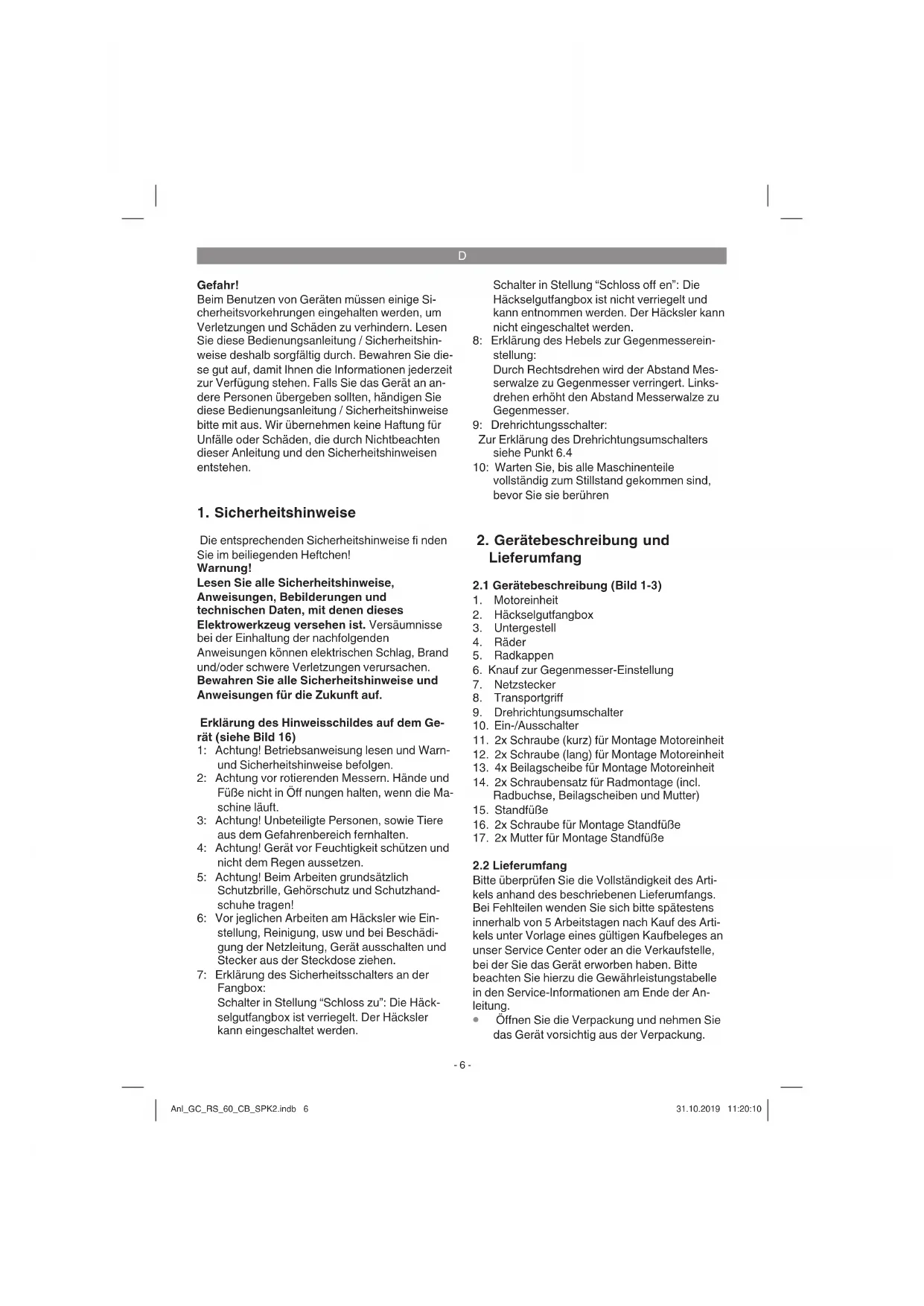 Die entsprechenden Sicherheitshinweise fi nden Sie im beiliegenden Heftchen! Warnung! Lesen Sie alle Sicherheitshinweise, Anweisungen, Bebilderungen und technischen Daten, mit denen dieses Elektrowerkzeug versehen ist. Versäumnisse bei der Einhaltung der nachfolgenden Anweisungen können elektrischen Schlag, Brand und/oder schwere Verletzungen verursachen. Bewahren Sie alle Sicherheitshinweise und Anweisungen für die Zukunft auf. Erklärung des Hinweisschildes auf dem Ge- rät (siehe Bild 16) 1: Achtung! Betriebsanweisung lesen und Warn- und Sicherheitshinweise befolgen. 2: Achtung vor rotierenden Messern. Hände und Füße nicht in Öff nungen halten, wenn die Ma- schine läuft. 3: Achtung! Unbeteiligte Personen, sowie Tiere aus dem Gefahrenbereich fernhalten. 4: Achtung! Gerät vor Feuchtigkeit schützen und nicht dem Regen aussetzen. 5: Achtung! Beim Arbeiten grundsätzlich Schutzbrille, Gehörschutz und Schutzhand- schuhe tragen! 6: Vor jeglichen Arbeiten am Häcksler wie Ein- stellung, Reinigung, usw und bei Beschädi- gung der Netzleitung, Gerät ausschalten und Stecker aus der Steckdose ziehen. 7: Erklärung des Sicherheitsschalters an der Fangbox: Schalter in Stellung “Schloss zu”: Die Häck- selgutfangbox ist verriegelt. Der Häcksler kann eingeschaltet werden. Schalter in Stellung “Schloss off en”: Die Häckselgutfangbox ist nicht verriegelt und kann entnommen werden. Der Häcksler kann nicht eingeschaltet werden. 8: Erklärung des Hebels zur Gegenmesserein- stellung: Durch Rechtsdrehen wird der Abstand Mes- serwalze zu Gegenmesser verringert. Links- drehen erhöht den Abstand Messerwalze zu Gegenmesser. 9: Drehrichtungsschalter: Zur Erklärung des Drehrichtungsumschalters siehe Punkt 6.4 10: Warten Sie, bis alle Maschinenteile vollständig zum Stillstand gekommen sind, bevor Sie sie berühren