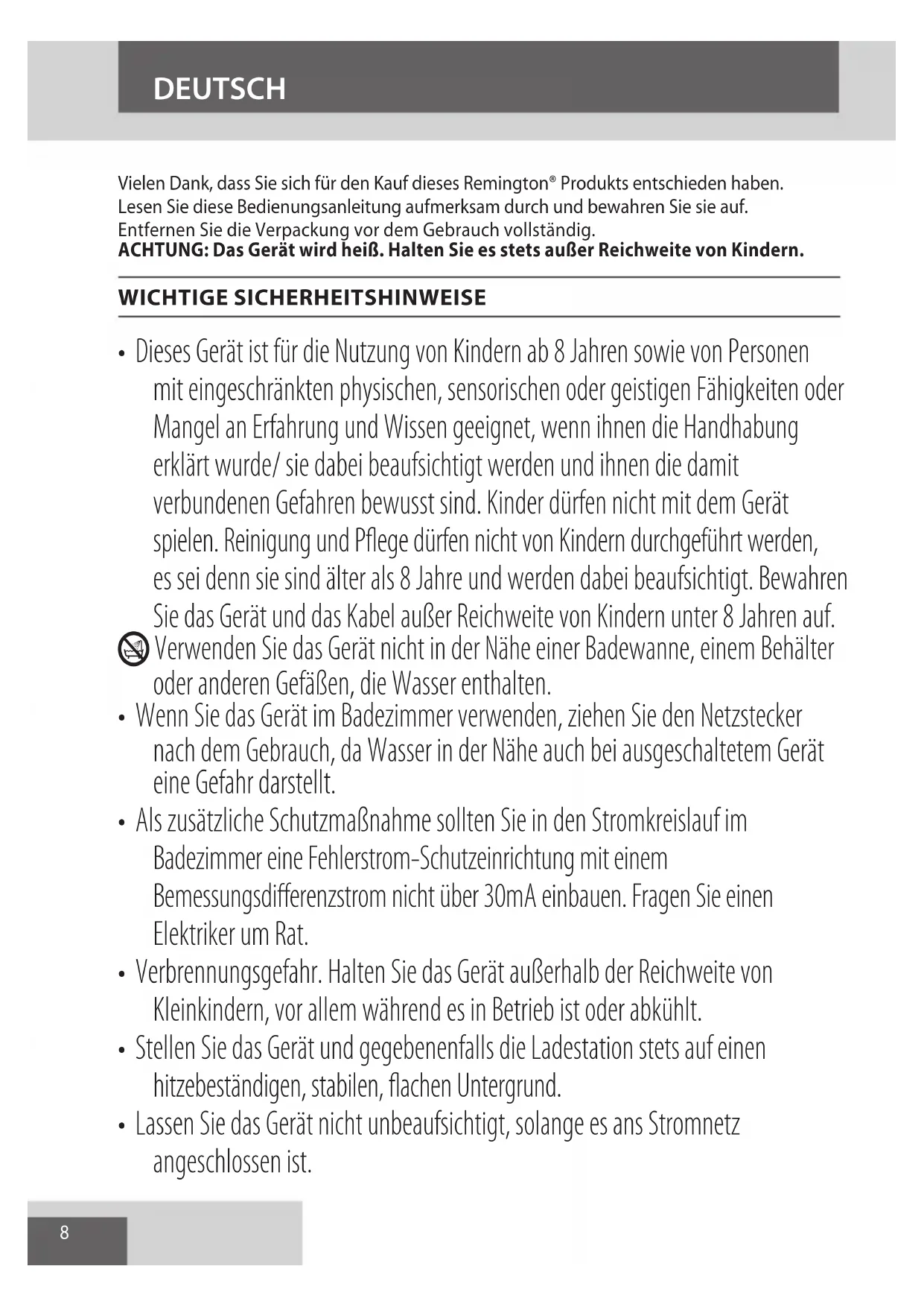 AE8 Vielen Dank, dass Sie sich für den Kauf dieses Remington® Produkts entschieden haben. Lesen Sie diese Bedienungsanleitung aufmerksam durch und bewahren Sie sie auf. Entfernen Sie die Verpackung vor dem Gebrauch vollständig. ACHTUNG: Das Gerät wird heiß. Halten Sie es stets außer Reichweite von Kindern. WICHTIGE SICHERHEITSHINWEISE