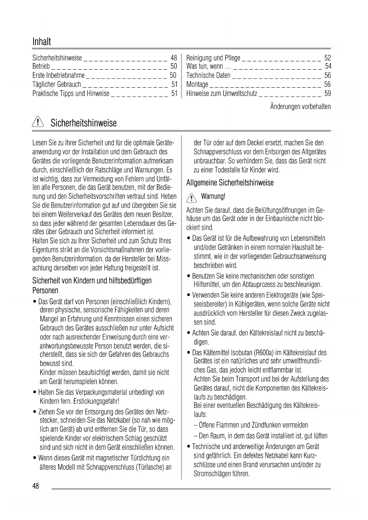 - Technische und anderweitige Änderungen am Gerät sind gefährlich. Ein defektes Netzkabel kann Kurz- schlüsse und einen Brand verursachen und/oder zu Stromschlägen führen. 48Warnung! Elektrische Bauteile (Netzkabel, Stecker, Kompressor) dürfen zur Vermeidung von Gefahren nur vom Kundendienst oder einer Fachkraft ausgewechselt werden.