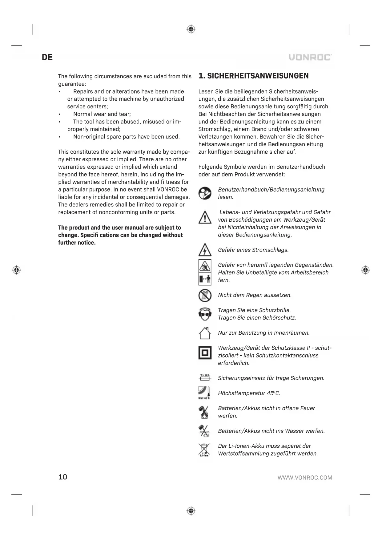 - Es wurden keine Original-Ersatzteile verwendet. Dies stellt die einzige Gewährleistung des Unterneh- mens dar, sowohl ausdrücklich als auch implizit. Es gibt keine anderen ausdrücklichen oder stillsch- weigenden Garantien, die über das hier Genannte hinausgehen, einschließlich der stillschweigenden Garantien der Marktgängigkeit oder Eignung für ei- nen bestimmten Zweck. In keinem Fall ist VONROC haftbar für Neben- oder Folgeschäden. Die Rechts- mittel des Händlers beschränken sich auf Reparatur oder Ersatz fehlerhafter Einheiten oder Teile. Am Produkt und am Benutzerhandbuch können Än- derungen vorgenommen werden. Die technischen Daten können sich ohne Vorankündigung ändern.18