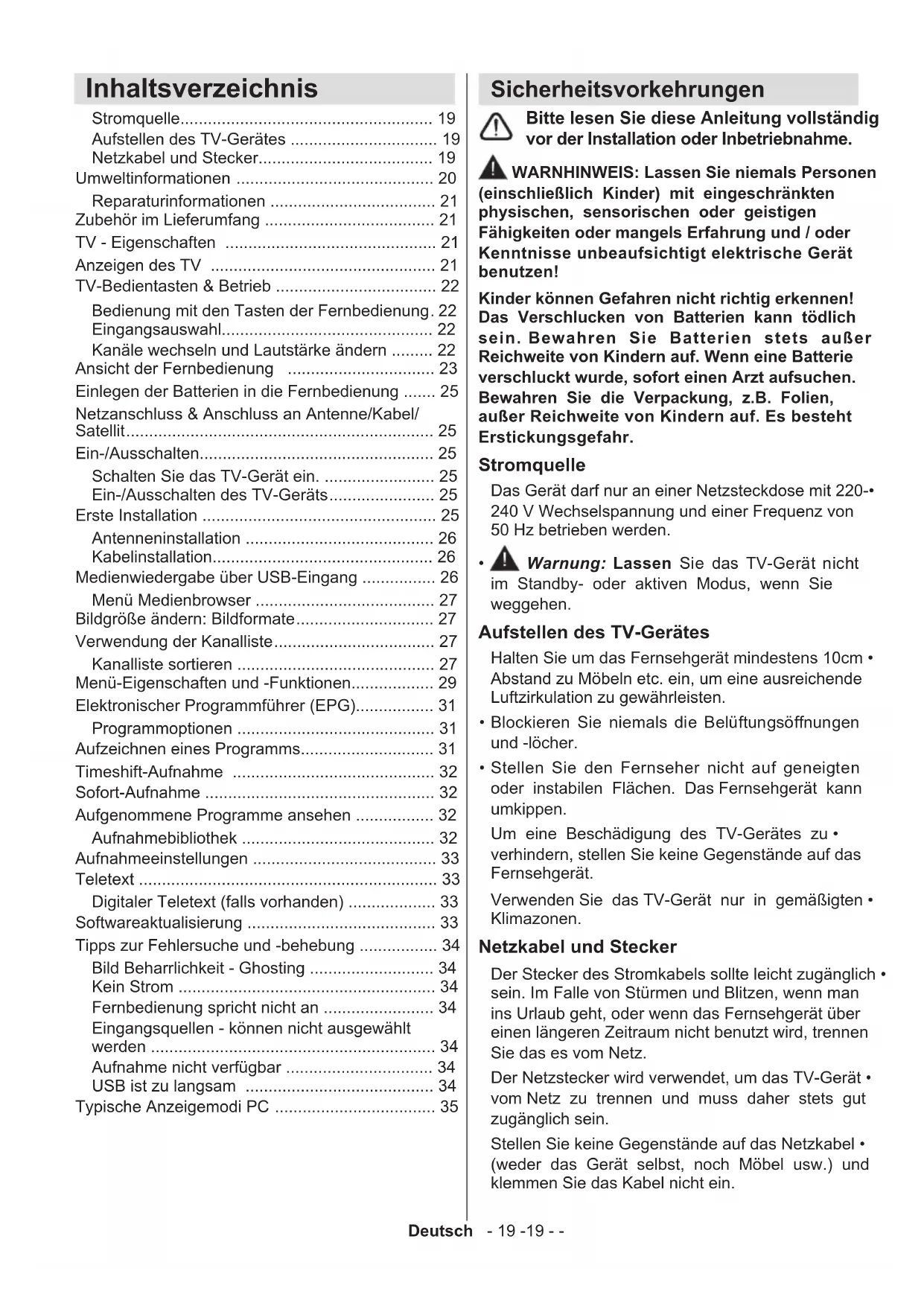 - Warnung: Lassen Sie das TV-Gerät nicht im Standby- oder aktiven Modus, wenn Sie weggehen. Aufstellen des TV-Gerätes Halten Sie um das Fernsehgerät mindestens 10cm • Abstand zu Möbeln etc. ein, um eine ausreichende Luftzirkulation zu gewährleisten. Blockieren Sie niemals• die Belüftungsöffnungen und -löcher. Stellen Sie den Fernseher nicht• auf geneigten oder instabilen Flächen. Das Fernsehgerät kann umkippen. Um eine Beschädigung des TV-Gerätes zu • verhindern, stellen Sie keine Gegenstände auf das Fernsehgerät. Verwenden Sie das TV-Gerät nur in gemäßigten • Klimazonen. Netzkabel und Stecker Der Stecker des Stromkabels sollte leicht zugänglich • sein. Im Falle von Stürmen und Blitzen, wenn man ins Urlaub geht, oder wenn das Fernsehgerät über einen längeren Zeitraum nicht benutzt wird, trennen Sie das es vom Netz. Der Netzstecker wird verwendet, um das TV-Gerät • vom Netz zu trennen und muss daher stets gut zugänglich sein. Stellen Sie keine Gegenstände auf das Netzkabel • (weder das Gerät selbst, noch Möbel usw.) und klemmen Sie das Kabel nicht ein. Inhaltsverzeichnis Stromquelle....................................................... 19 Aufstellen des TV-Gerätes ................................ 19 Netzkabel und Stecker...................................... 19 Umweltinformationen ........................................... 20 Reparaturinformationen .................................... 21 Zubehör im Lieferumfang ..................................... 21 TV - Eigenschaften .............................................. 21 Anzeigen des TV ................................................. 21 TV-Bedientasten & Betrieb ................................... 22 Bedienung mit den Tasten der Fernbedienung . 22 Eingangsauswahl.............................................. 22 Kanäle wechseln und Lautstärke ändern ......... 22 Ansicht der Fernbedienung ................................ 23 Einlegen der Batterien in die Fernbedienung ....... 25 Netzanschluss & Anschluss an Antenne/Kabel/ Satellit ................................................................... 25 Ein-/Ausschalten................................................... 25 Schalten Sie das TV-Gerät ein. ........................ 25 Ein-/Ausschalten des TV-Geräts ....................... 25 Erste Installation ................................................... 25 Antenneninstallation ......................................... 26 Kabelinstallation................................................ 26 Medienwiedergabe über USB-Eingang ................ 26 Menü Medienbrowser ....................................... 27 Bildgröße ändern: Bildformate .............................. 27 Verwendung der Kanalliste ................................... 27 Kanalliste sortieren ........................................... 27 Menü-Eigenschaften und -Funktionen.................. 29 Elektronischer Programmführer (EPG)................. 31 Programmoptionen ........................................... 31 Aufzeichnen eines Programms............................. 31 Timeshift-Aufnahme ............................................ 32 Sofort-Aufnahme .................................................. 32 Aufgenommene Programme ansehen ................. 32 Aufnahmebibliothek .......................................... 32 Aufnahmeeinstellungen ........................................ 33 Teletext ................................................................. 33 Digitaler Teletext (falls vorhanden) ................... 33 Softwareaktualisierung ......................................... 33 Tipps zur Fehlersuche und -behebung ................. 34 Bild Beharrlichkeit - Ghosting ........................... 34 Kein Strom ........................................................ 34 Fernbedienung spricht nicht an ........................ 34 Eingangsquellen - können nicht ausgewählt werden .............................................................. 34 Aufnahme nicht verfügbar ................................ 34 USB ist zu langsam ......................................... 34 Typische Anzeigemodi PC ................................... 35Deutsch - 20 -20 - - Handhaben Sie das Netzkabel immer am Stecker, • trennen Sie das TV-Gerät nicht durch Ziehen des Netzsteckers vom Netz. Berühren Sie niemals das Netzkabel / den Stecker • mit nassen Händen, da dies einen Kurzschluss oder elektrischen Schlag verursachen kann. Machen Sie niemals Knoten in das Netzkabel, und • binden Sie es nie mit anderen Kabeln zusammen. Das Netzkabel muss so verlegt werden, dass • niemand auf das Kabel treten kann. Beschädigungen am Netzkabel/Netzstecker • können zu Bränden oder Stromschlägen führen. Wenn es beschädigt ist, muss sie ersetzt werden, jedochsolltediesnurvonqualiziertemPersonal durchgeführt werden. Stellen Sie keine mit Flüssigkeit gefüllten Behälter, • wie z.B. Blumenvasen auf das Gerät. Meiden Sie Tropf- und Spritzwasser. Sollte ein harter Gegenstand auf das Gerät fallen • oder Flüssigkeit in das Gerät eindringen, müssen Sie dasGerätaussteckenunddurcheinequalizierte Fachkraft überprüfen lassen, bevor es wieder betrieben werden kann. Feuchtigkeit und Wasser Verwenden Sie dieses Gerät nicht in feuchter oder dunstiger Umgebung (vermeiden Sie das Badezimmer, die Spüle in der Küche oder die Umgebung der Waschmaschine). Achten Sie darauf, dass dieses Gerät niemals Regen oder Wasser ausgesetzt ist, und stellen Sie keine mit Flüssigkeit gefüllten Gefäße, wie zum Beispiel Blumenvasen, auf dem Gerät ab. Meiden Sie Tropf- und Spritzwasser, da dies zu einem Kurzschluss, Stromschlag oder Defekt des Gerätes führen kann. Sollte ein harter Gegenstand auf das Gerät fallen oder Flüssigkeit in das Gerät eindringen, müssen Sie das Gerät vom Netz trennen und durch eine qualizierte Fachkraft überprüfen lassen, bevor es wieder betrieben werden kann. Belüftung Die Schlitze und Öffnungen des Empfängers dienen der Belüf