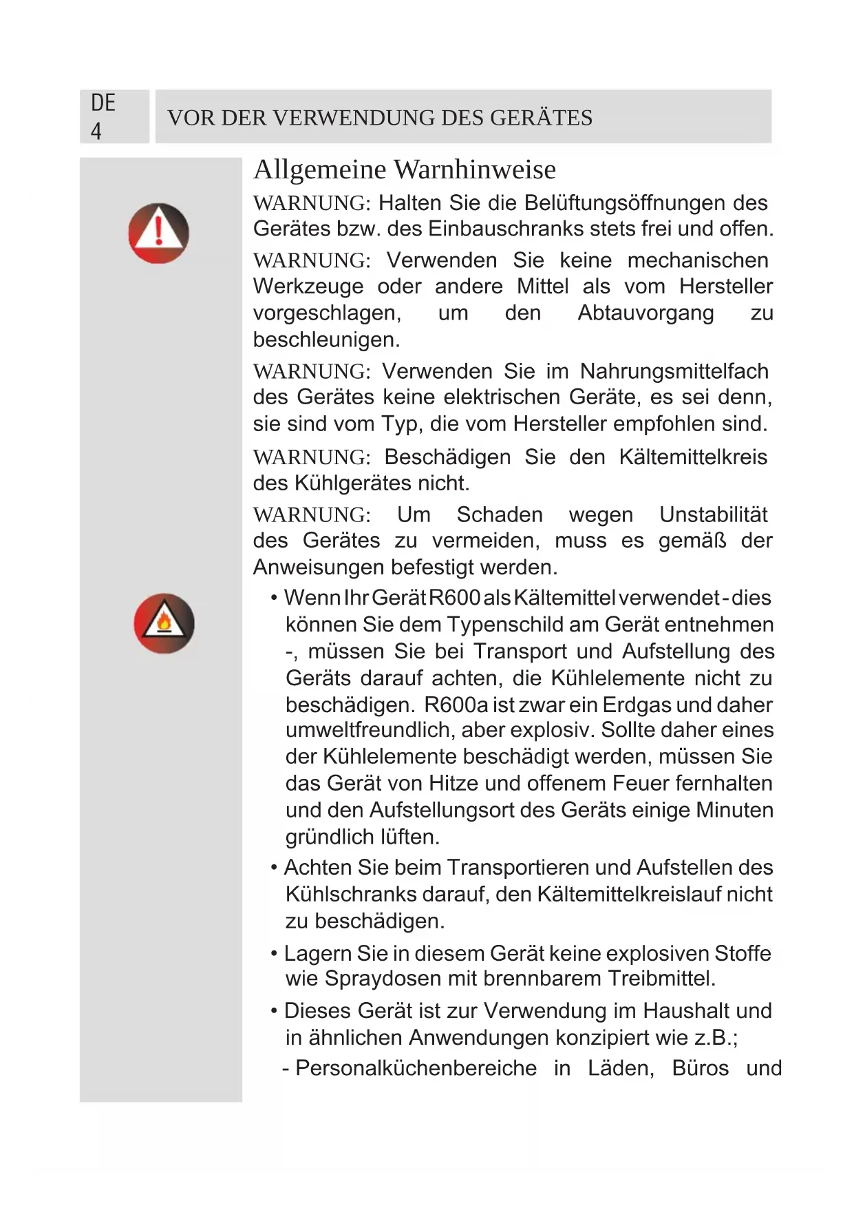 Allgemeine Warnhinweise WARNUNG: Halten Sie die Belüftungsöffnungen des Gerätes bzw. des Einbauschranks stets frei und offen. WARNUNG: Verwenden Sie keine mechanischen Werkzeuge oder andere Mittel als vom Hersteller vorgeschlagen, um den Abtauvorgang zu beschleunigen. WARNUNG: Verwenden Sie im Nahrungsmittelfach des Gerätes keine elektrischen Geräte, es sei denn, sie sind vom Typ, die vom Hersteller empfohlen sind. WARNUNG: Beschädigen Sie den Kältemittelkreis des Kühlgerätes nicht. WARNUNG: Um Schaden wegen Unstabilität des Gerätes zu vermeiden, muss es gemäß der Anweisungen befestigt werden.
