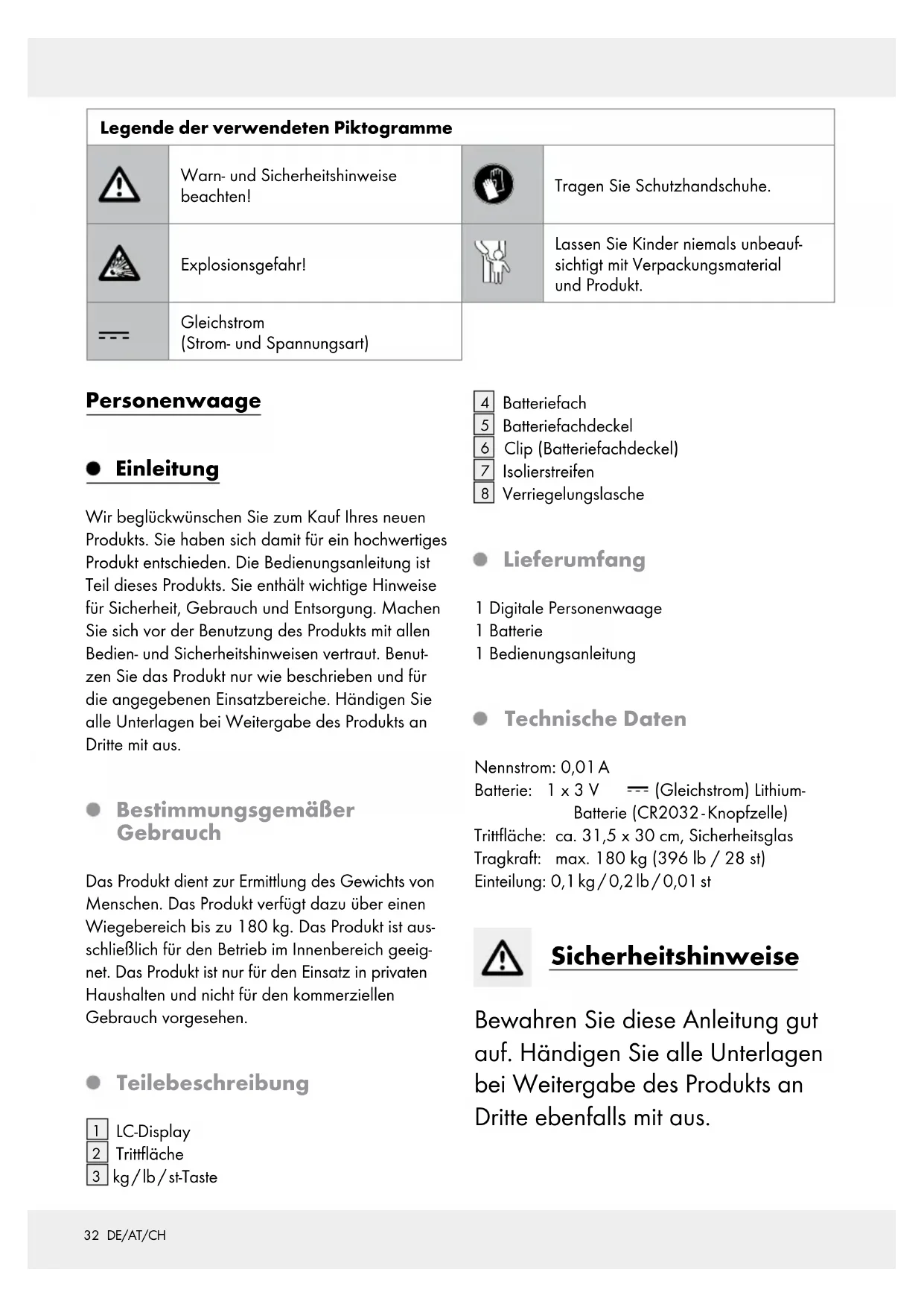 Lieferumfang 1 Digitale Personenwaage 1 Batterie 1 Bedienungsanleitung Technische Daten Nennstrom: 0,01 A Batterie: 1 x 3 V (Gleichstrom) Lithium- Batterie (CR2032 - Knopfzelle) Trittfläche: ca. 31,5 x 30 cm, Sicherheitsglas Tragkraft: max. 180 kg (396 lb / 28 st) Einteilung: 0,1 kg / 0,2 lb / 0,01 st Sicherheitshinweise Bewahren Sie diese Anleitung gut auf. Händigen Sie alle Unterlagen bei Weitergabe des Produkts an Dritte ebenfalls mit aus. Legende der verwendeten Piktogramme Warn- und Sicherheitshinweise beachten! Tragen Sie Schutzhandschuhe. Explosionsgefahr! Lassen Sie Kinder niemals unbeauf- sichtigt mit Verpackungsmaterial und Produkt. Gleichstrom (Strom- und Spannungsart)33 DE/AT/CH LE-