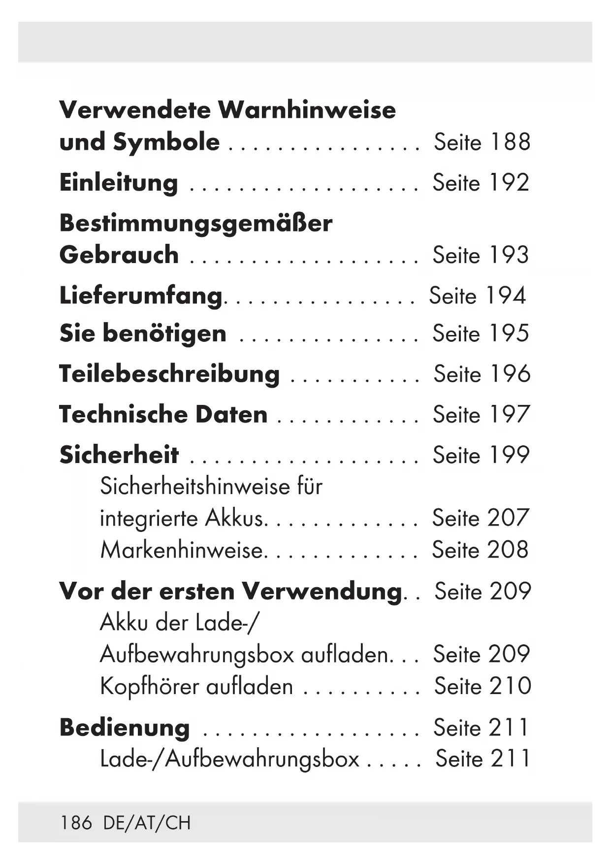 voldoet aan de EU-richtlijnen 2014/53/EU en 2011/65/EU. De volledige tekst van de EU-conformiteitsverklaring is op het volgende internetadres beschikbaar: www.owim.com182 NL/BE Garantie Het product wordt volgens strenge kwaliteitsrichtlijnen zorgvuldig geproduceerd en voor levering grondig getest. In geval van schade aan het product kunt u rechtmatig beroep doen op de verkoper van het product. Deze wettelijke rechten worden door onze hierna vermelde garantie niet beperkt. Op dit product verlenen wij 3 jaar garantie vanaf aankoopdatum. De garantieperiode start op de dag van aankoop. Bewaar de originele kassabon alstublieft. Dit document is nodig als bewijs voor aankoop.183 NL/BE Wanneer binnen 3 jaar na de aankoopdatum van dit product een materiaal- of productiefout optreedt, dan wordt het product door ons – naar onze keuze – gratis voor u gerepareerd of vervangen. Deze garantie komt te vervallen als het product beschadigd wordt, niet correct gebruikt of onderhouden wordt. De garantie geldt voor materiaal- en productiefouten. Deze garantie is niet van toepassing op productonderdelen, die onderhevig zijn aan normale slijtage en hierdoor als aan slijtage onderhevige onderdelen gelden (bijv. batterijen) of voor beschadigingen aan breekbare onderdelen, zoals bijv. schakelaars, accu’s of dergelijke onderdelen, die gemaakt zijn van glas.184 NL/BE Afwikkeling in geval van garantie Om een snelle afhandeling van uw reclamatie te waarborgen dient u de volgende instructies in acht te nemen: Houd bij alle vragen alstublieft de kassabon en het artikelnummer (bijv. IAN 123456_7890) als bewijs van aankoop bij de hand. Het artikelnummer vindt u op de typeplaat, ingegraveerd, op het titelblad van uw handleiding (linksonder) of als sticker op de achter- of onderzijde. Wanneer er storingen in de werking of andere gebreken optreden, dient u eerst telefonisch of per e-mail contact met de onderstaande service-afdeling op te nemen.185 NL/BE Een als defect geregistreerd product kunt u dan samen met uw aankoopbewijs (kassabon) en vermelding van de concrete schade alsmede het tijdstip van optreden voor u franco aan het u meegedeelde servicepunt verzenden. Service Service Nederland Tel.: 0900 0400 223 (0,10 EUR/Min.) E-Mail: owim@lidl.nl Service Belgiё Tel.: 070 270 171 (0,15 EUR/Min.) E-Mail: owim@lidl.be186 DE/AT/CH Verwendete Warnhinweise und Symbole ................ Seite 188 Einleitung ................... Seite 192 Bestimmungsgemäßer Gebrauch ................... Seite 193 Lieferumfang................ Seite 194 Sie benötigen ............... Seite 195 Teilebeschreibung ........... Seite 196 Technische Daten ............ Seite 197 Sicherheit ................... Seite 199 Sicherheitshinweise für integrierte Akkus............. Seite 207 Markenhinweise............. Seite 208 Vor der ersten Verwendung.. Seite 209 Akku der Lade-/ Aufbewahrungsbox aufladen... Seite 209 Kopfhörer aufladen .......... Seite 210 Bedienung .................. Seite 211 Lade-/Aufbewahrungsbox ..... Seite 211187 DE/AT/CH Kopfhörer ................... Seite 213 Kopfhörer einschalten ........ Seite 213 Kopfhörer ausschalten . . . . . . . . Seite 214 Kopfhörer manuell ausschalten ................ Seite 214 LED-Status ................. Seite 215 Kopfhörer miteinander koppeln ................... Seite 216 Kopfhörer mit einem Bluetooth-Gerät koppeln ...... Seite 217 Auf die Werkseinstellungen zurücksetzen................ Seite 218 Fernsteuermöglichkeiten....... Seite 219 Reinigung und Pflege ........ Seite 221 Lagerung .................. Seite 222 Fehlerbehebung ............. Seite 223 Entsorgung .................. Seite 225 Vereinfachte EU‑Konformitätserklärung ... Seite 227 Garantie .................... Seite 228188 DE/AT/CH Verwendete Warnhinweise und Symbole In dieser Bedienungsanleitung werden folgende Warnhinweise verwendet: GEFAHR! Dieses Symbol mit dem Signalwort „Gefahr“ bezeichnet eine Gefährdung mit einem hohen Risikograd, die, wenn sie nicht vermieden wird, eine schwere Verletzung oder den Tod zur Folge hat. WARNUNG! Dieses Symbol mit dem Signalwort „Warnung“ bezeichnet eine Gefährdung mit einem mittleren Risikograd, die, wenn sie nicht vermieden wird, eine schwere Verletzung oder den Tod zur Folge haben kann.189 DE/AT/CH VORSICHT! Dieses Symbol mit dem Signalwort „Vorsicht“ bezeichnet eine Gefährdung mit einem niedrigen Risikograd, die, wenn sie nicht vermieden wird, eine geringe oder mäßige Verletzung zur Folge haben kann. ACHTUNG! Dieses Symbol mit dem Signalwort „Achtung“ zeigt die Gefahr einer möglichen Sachbeschädigung an. HINWEIS: Dieses Symbol mit dem Signalwort „Hinweis“ bietet weitere nützliche Informationen.190 DE/AT/CH VORSICHT! EXPLOSIONSGEFAHR! Eine Warnung, welche mit diesem Zeichen und den Worten „VORSICHT! EXPLOSIONSGEFAHR!“ versehen ist, weist auf eine mögliche Explosionsgefahr hin. Wird ein solcher Warnhinweis nicht befolgt, kann das ernsthafte Verletzungen nach sich ziehen oder tödlich enden und möglichen Sachschaden nach sich ziehen. Folgen Sie den Anweisungen in dieser Warnung, um schwere Verletzungen, Lebensgefahr oder die Gefahr von Sachschäden zu verhindern!191 DE/AT/CH Dieses Gebotszeichen weist darauf hin, geeignete Schutzhandschuhe zu tragen! Folgen Sie diesem Warnhinweis, um Handverletzungen durch Gegenstände oder Kontakt mit heißen oder chemischen Materialien zu vermeiden! Ein Warnhinweis mit diesem Symbol informiert den Benutzer über mögliche Hörschaden. Vermeiden Sie es, über längere Zeiträume hohe Lautstärken zu hören. Gleichstrom / Spannung192 DE/AT/CH